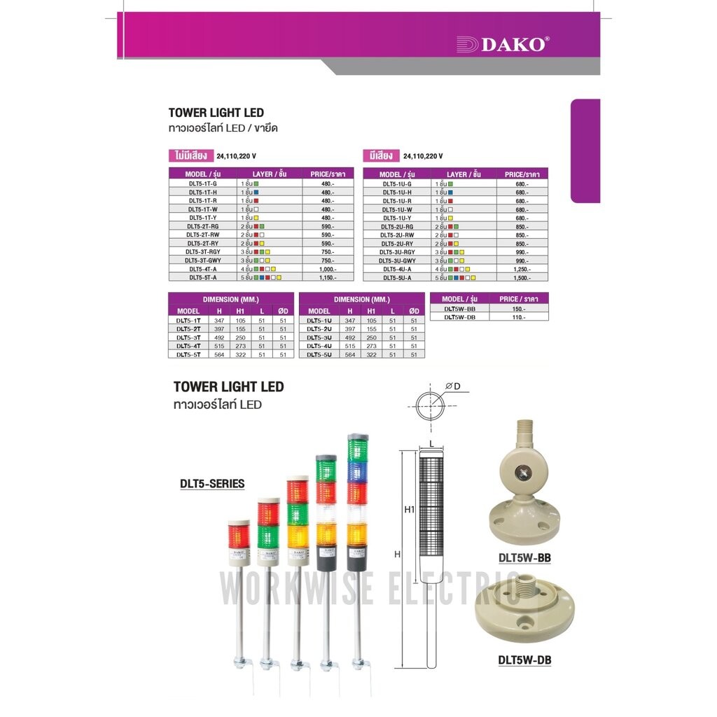 DAKO DLT5-1T-Y ทาวเวอร์ไลท์ แอลอีดี (TOWER LIGHT LED) 1 ชั้น สีเหลือง (ไม่มีเสียง) 24VAC/VDC & 110, 220VAC