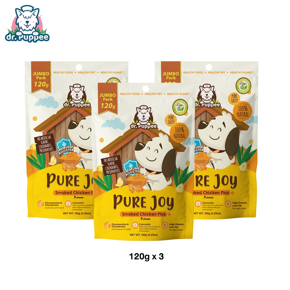 (BBF:01/04/26) PURE Joy Smoked Chicken Plus+ ขนมสุนัขเพื่อสุขภาพ สูตรไก่รมควันพลัส+ขมิ้นชัน เสริมภูมิต้านทาน (120g)