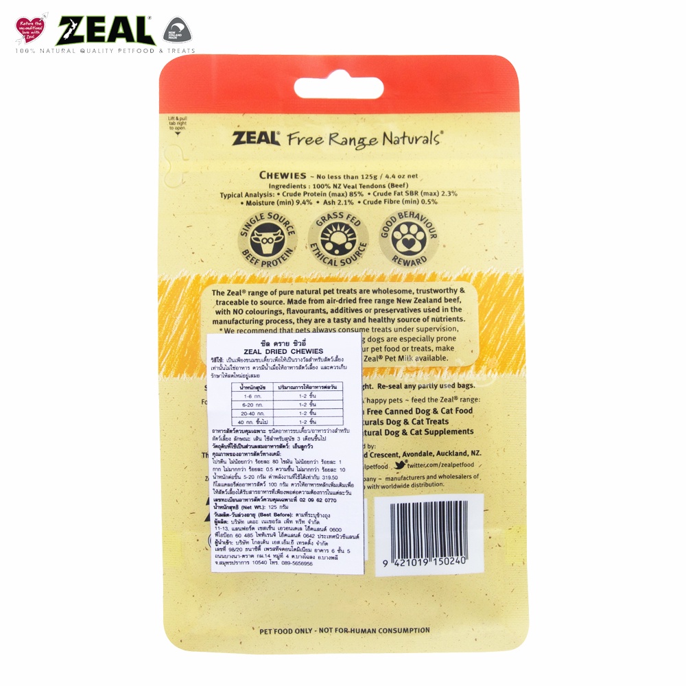 ZEAL Chewies (วัว) เอ็นลูกวัวนิวซีแลนด์ ขนมสุนัข เคี้ยวสนุก ช่วยเพิ่มน้ำมันไขข้อ (125g)
