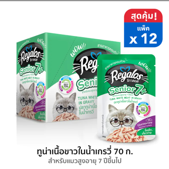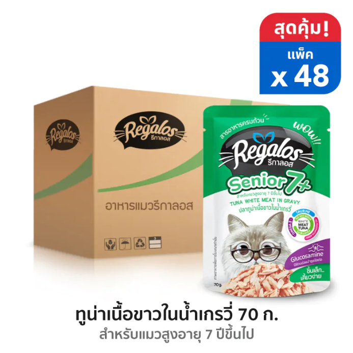 Regalos Senior Tuna in Gravy รีกาลอส อาหารแมวแบบเปียก ปลาทูน่าเนื้อขาวในน้ำเกรวี่ แมวสูงอายุ 7 ปี ขึ้นไป (70g)