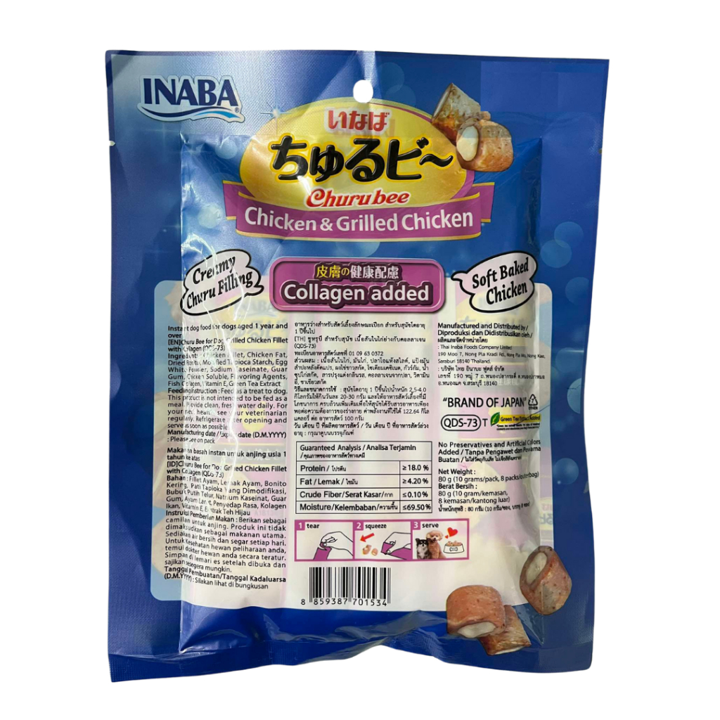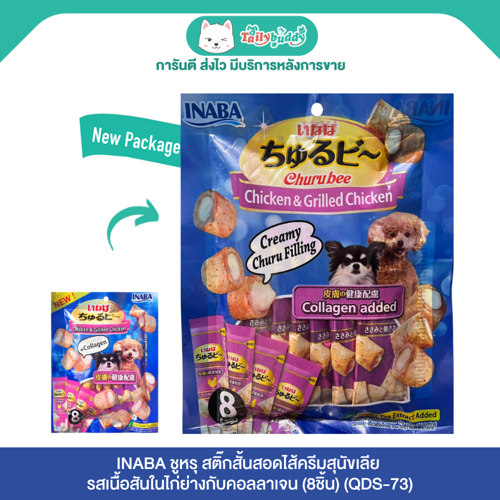 INABA ชูหรุบี ขนมสุนัข สติ๊กสั้นสอดไส้ครีมสุนัขเลีย รสเนื้อสันในไก่ย่างกับคอลลาเจน (8ชิ้น) (QDS-73)