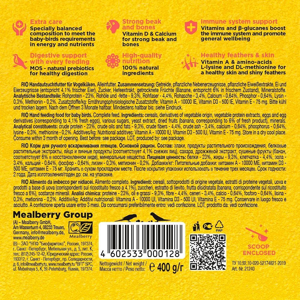 RIO Hand feeding food อาหารนกลูกป้อน ตั้งแต่แรกเกิด สำหรับนกทุกสายพันธุ์ เติบโตแข็งแรง โครงสร้างดี ขนสวย (400g)