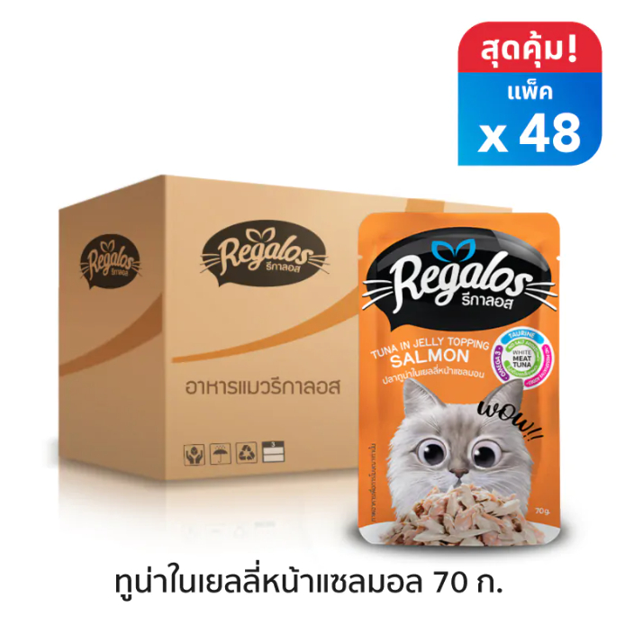 Regalos Tuna in Jelly Topping Salmon รีกาลอส อาหารแมวแบบเปียก ปลาทูน่าในเยลลี่หน้าปลาแซลมอน (70g)
