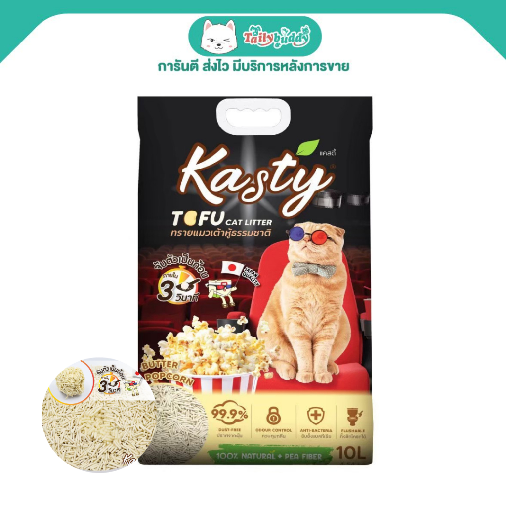 Kasty ทรายแมวเต้าหู้ กลิ่นป๊อปคอร์นอบเนย ผลิตจากถั่วลันเตาธรรมชาติ ไร้ฝุ่น เก็บกลิ่นดี เม็ดเล็ก