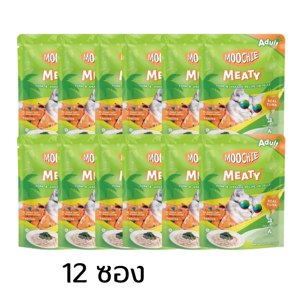 Moochie Meaty อาหารเปียกแมวเนื้อทูน่าแท้ สูตรทูน่าและสาหร่ายวากาเมะในนํ้าเกรวี่ (70g)