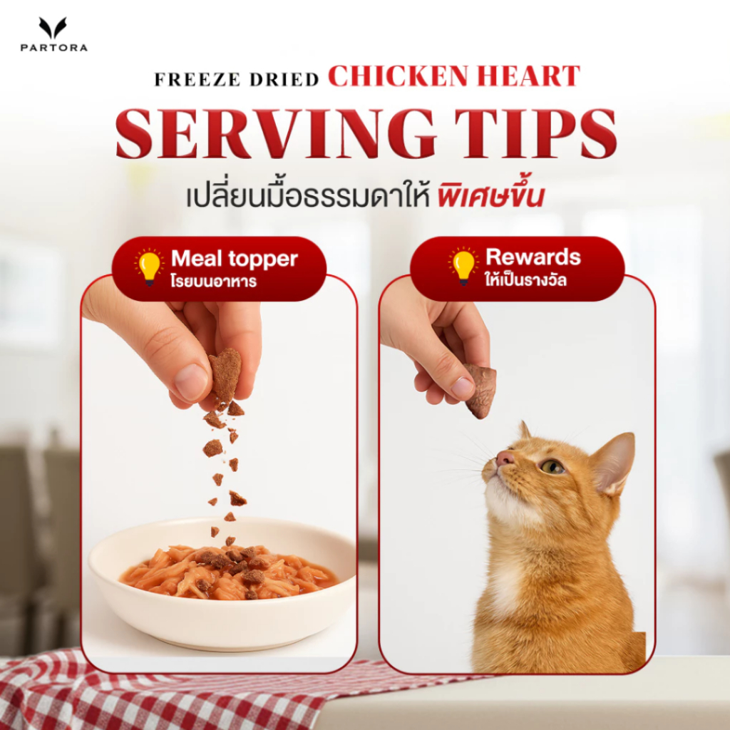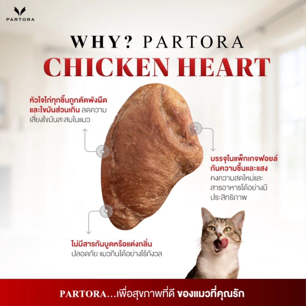 PARTORA หัวใจไก่ฟรีซดราย ขนมฟรีซดรายสำหรับแมว เป็นแหล่ง ทอรีน ไขมันน้อย ย่อยง่าย (100g)