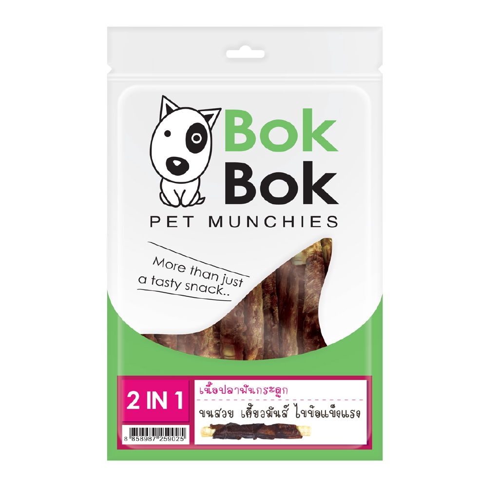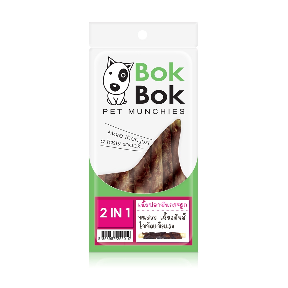 Bok Bok ขนมสุนัข สูตรเนื้อปลาพันกระดูก 2in1 ขนสวย เคี้ยวมันส์ ไขข้อแข็งแรง (50g)