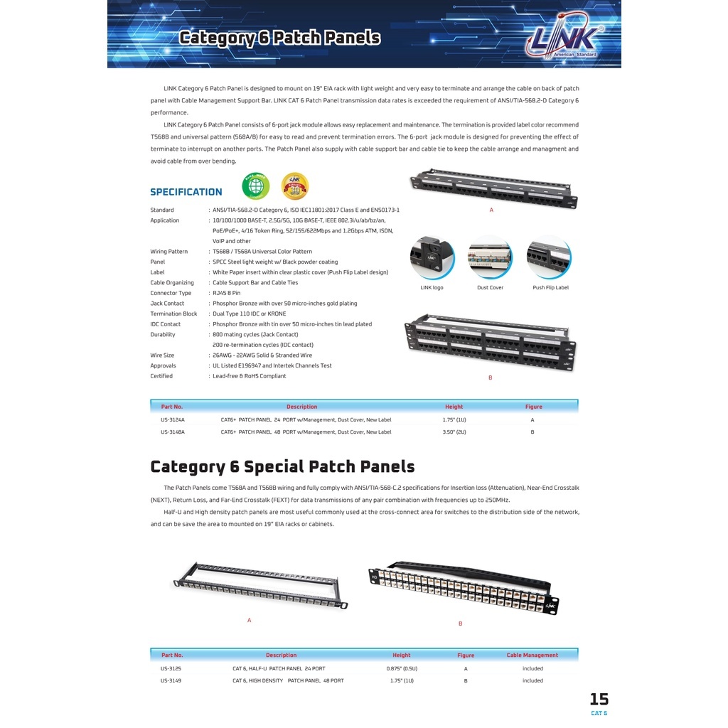 LINK Patch Panel 24 Port CAT6 แผงกระจายสายแลน รุ่น US-3124A