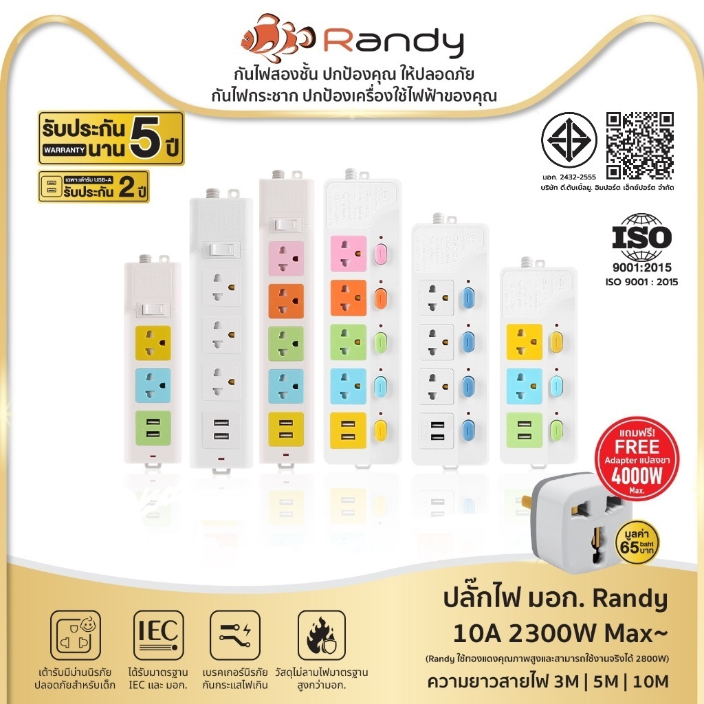Randy ปลั๊กไฟ กันไฟสองชั้น มอก. 3M 5M 10A 2300W รางปลั๊ก สายไฟ 100%ทองแดง ปลั๊กพ่วง ปลั๊กไฟ ชาร์จเร็ว