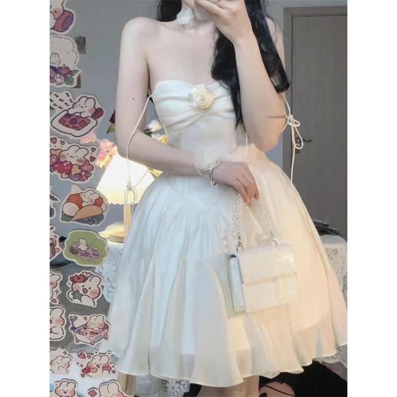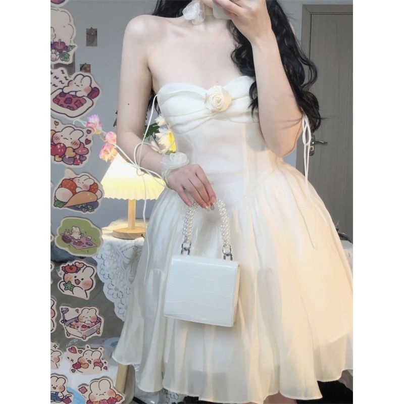✨🍑ส่งไวจากไทย🍃 เดรสคุณหนู สไตล์อ่อนโยน ปักดอกกุหลาบ ชุดเดรสเกาะอกกระโปรง