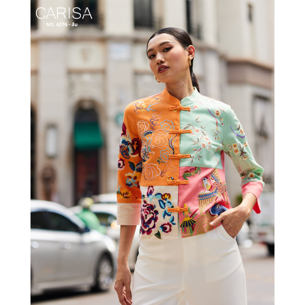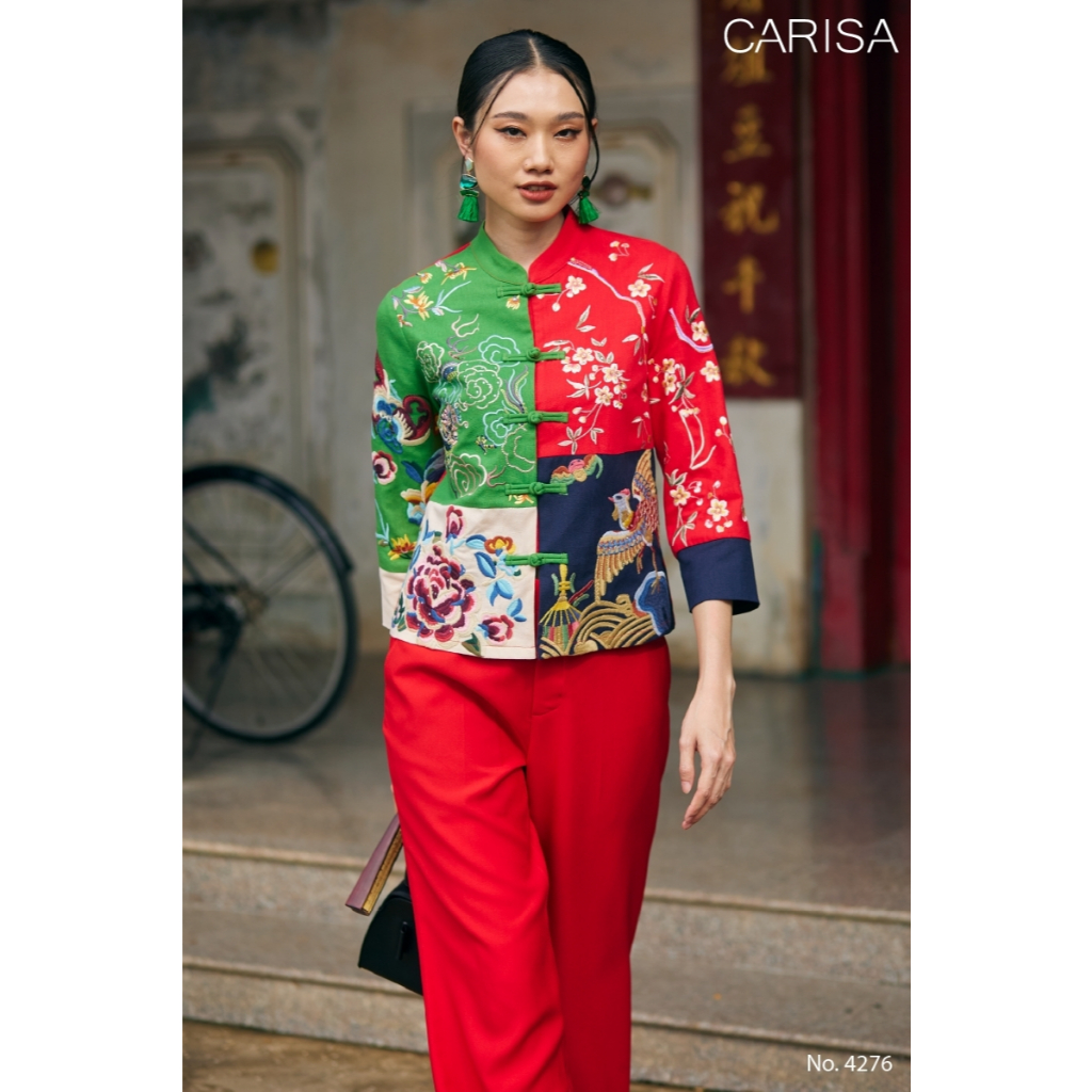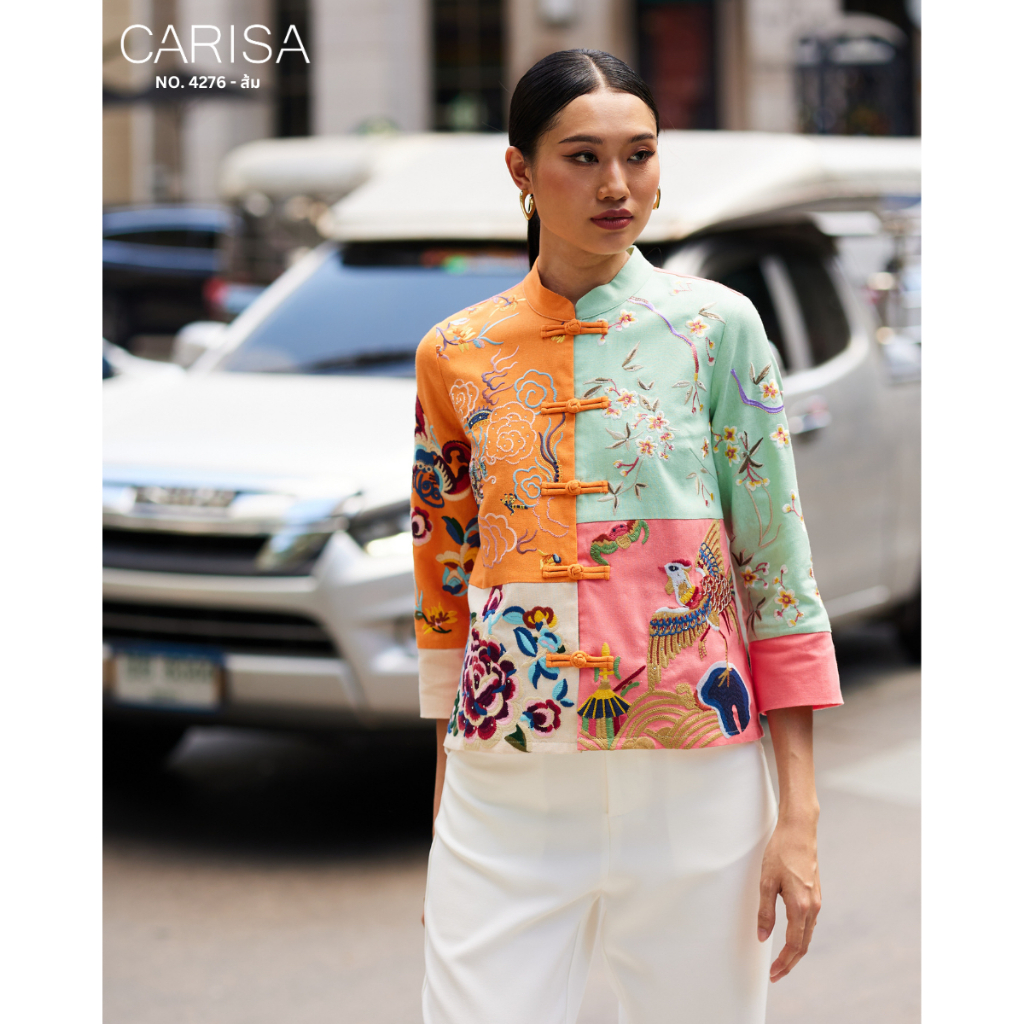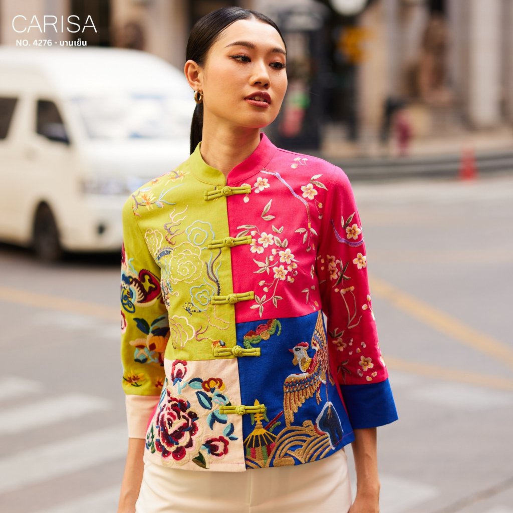 Carisa เสื้อคอจีน งานปักลายดอกโบตั๋น นกยูง มังกร ลงบนตัวเสื้อใช้ผ้าละนินผสมคอตตอล 4 สี กระดุมจริงหน้า [4276]