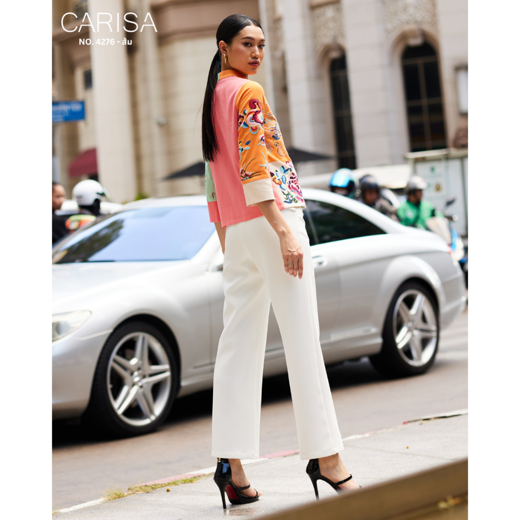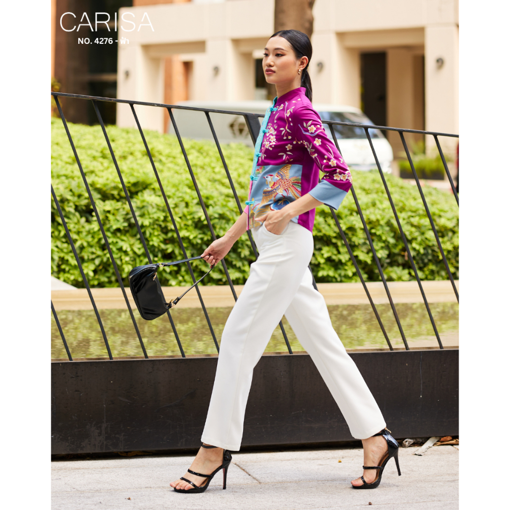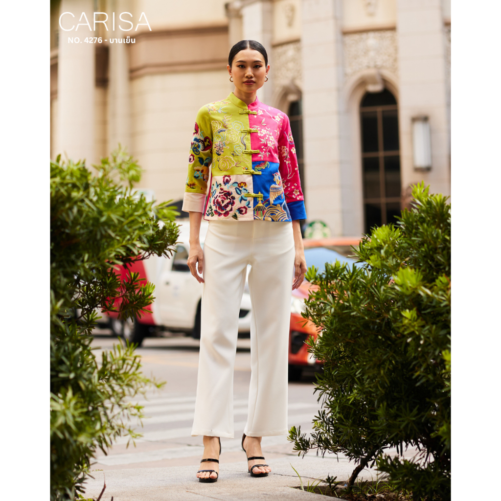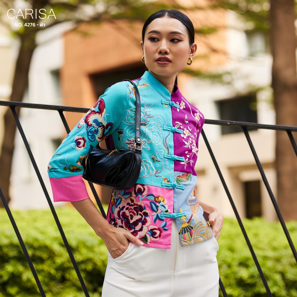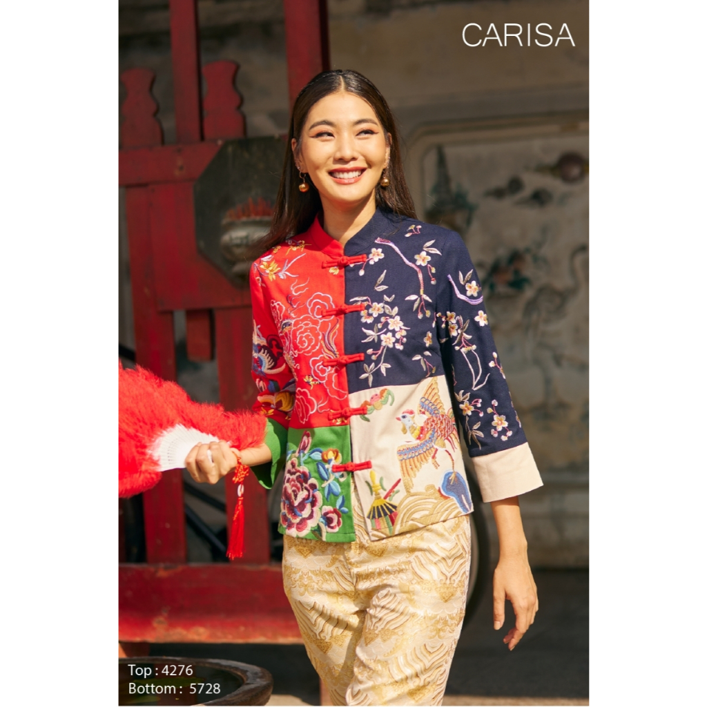 Carisa เสื้อคอจีน งานปักลายดอกโบตั๋น นกยูง มังกร ลงบนตัวเสื้อใช้ผ้าละนินผสมคอตตอล 4 สี กระดุมจริงหน้า [4276]