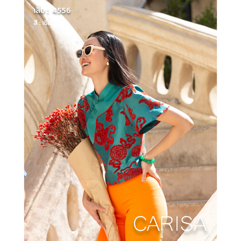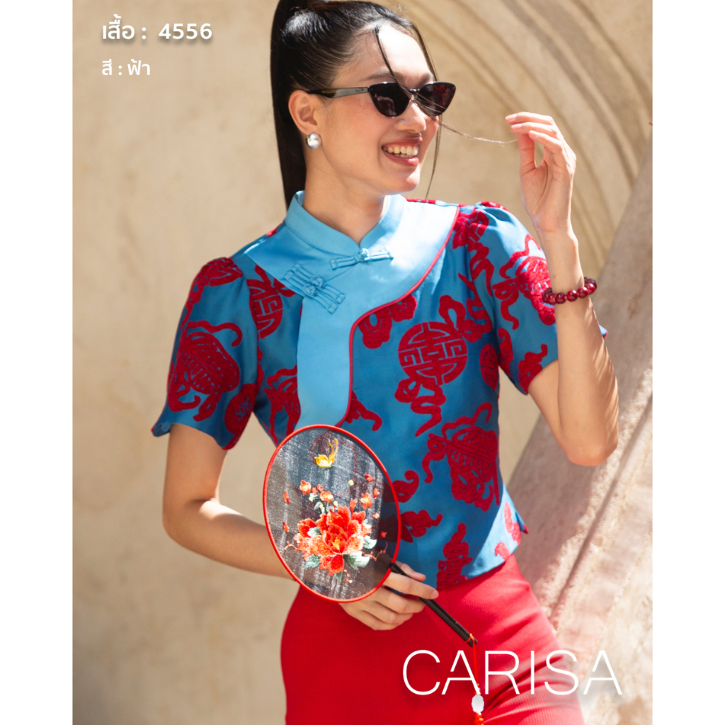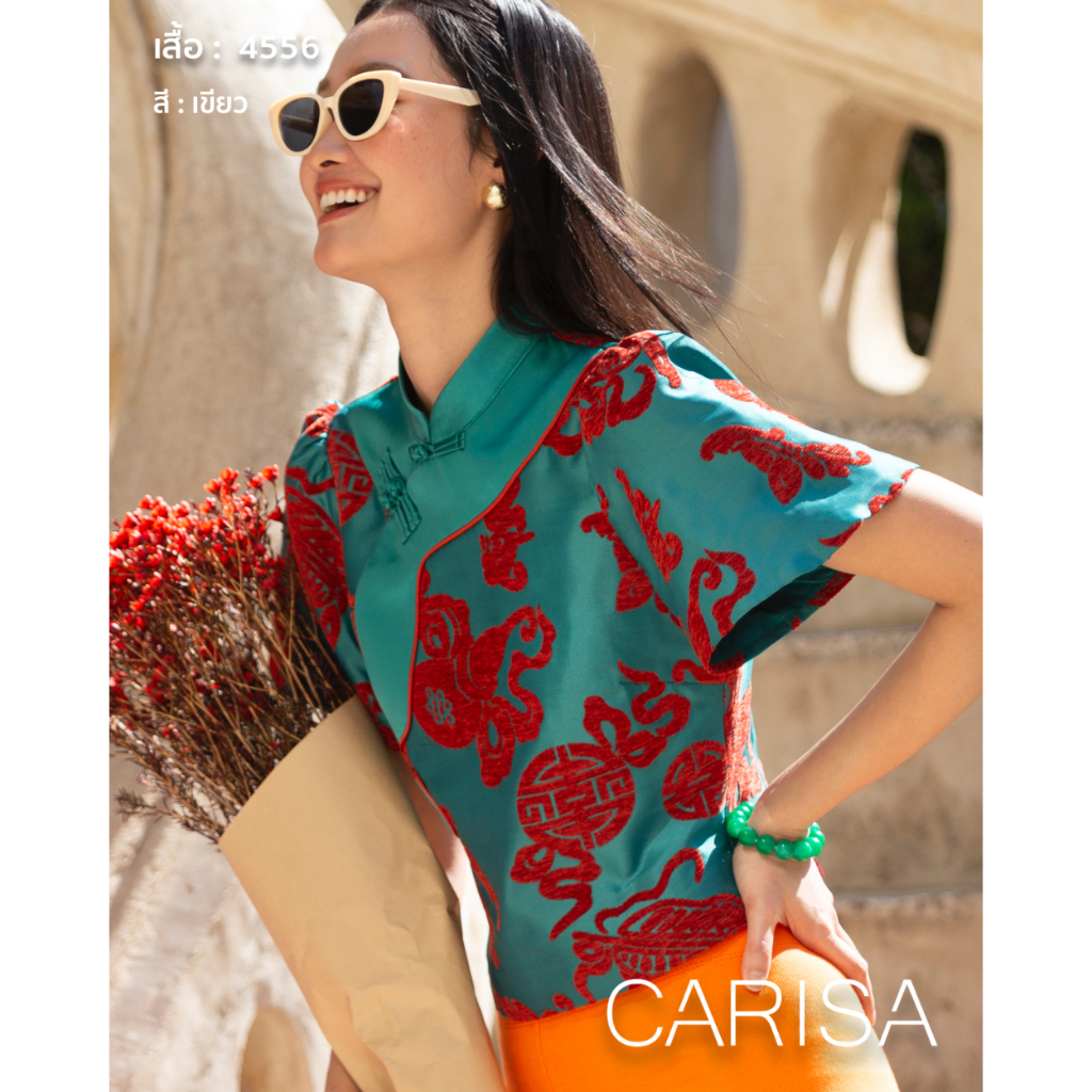 [4556] เสื้อคอจีน เนื้อผ้าเป็นผ้าไหมเนื้ออย่างดีใส่สบาย ทอลายดิ้นกำมะหยี่ 3 มิติ แขนสั้น ตกแต่งกระดุมจีนด้านหน้า มีซับใน