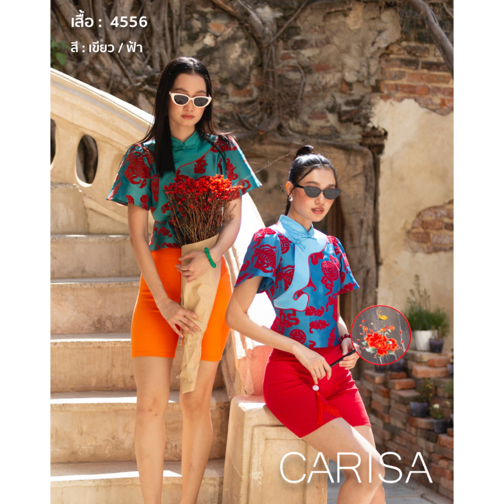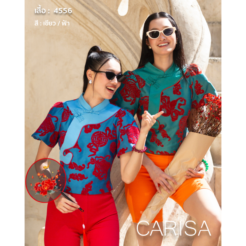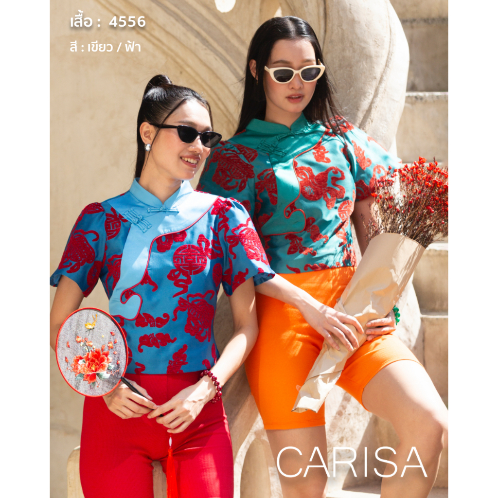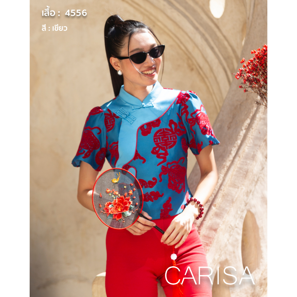 [4556] เสื้อคอจีน เนื้อผ้าเป็นผ้าไหมเนื้ออย่างดีใส่สบาย ทอลายดิ้นกำมะหยี่ 3 มิติ แขนสั้น ตกแต่งกระดุมจีนด้านหน้า มีซับใน