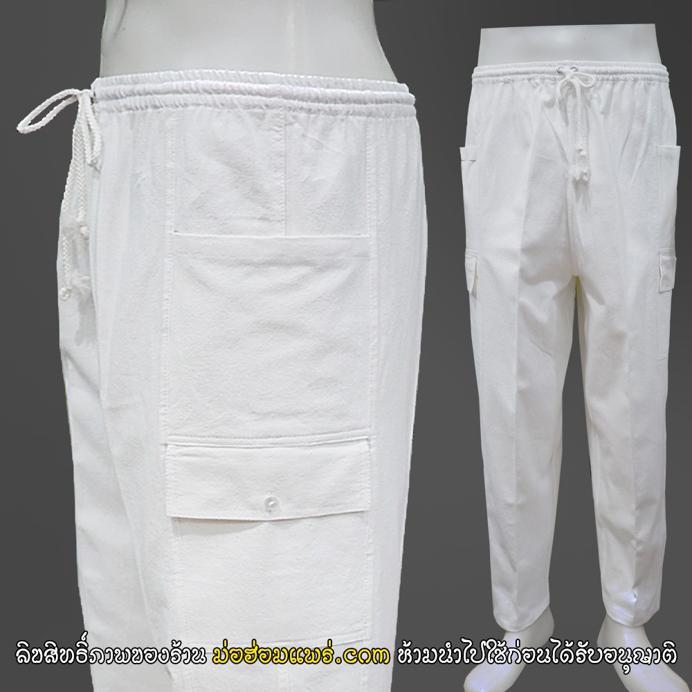 กางเกงผ้าฝ้าย สีขาวเนื้อดี มีกระเป๋า 4 ใบ เอวยางยืด