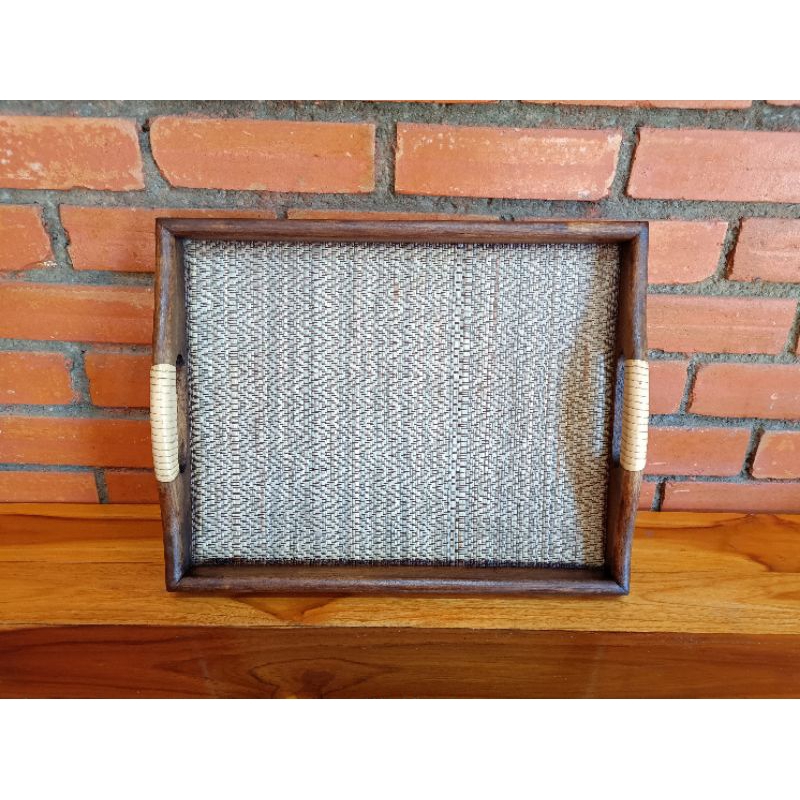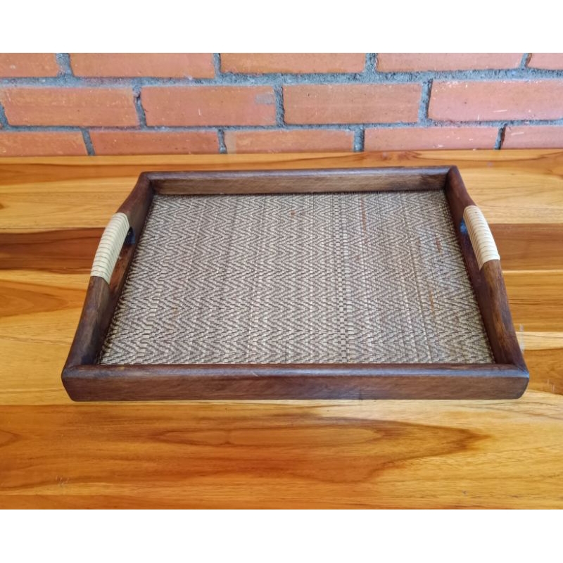 ถาดไม้ ถาดเสริฟอาหาร ถาดไม้มีหูจับ ขนาด 28*36*5.5 เซน แบบเสื่อขาว
