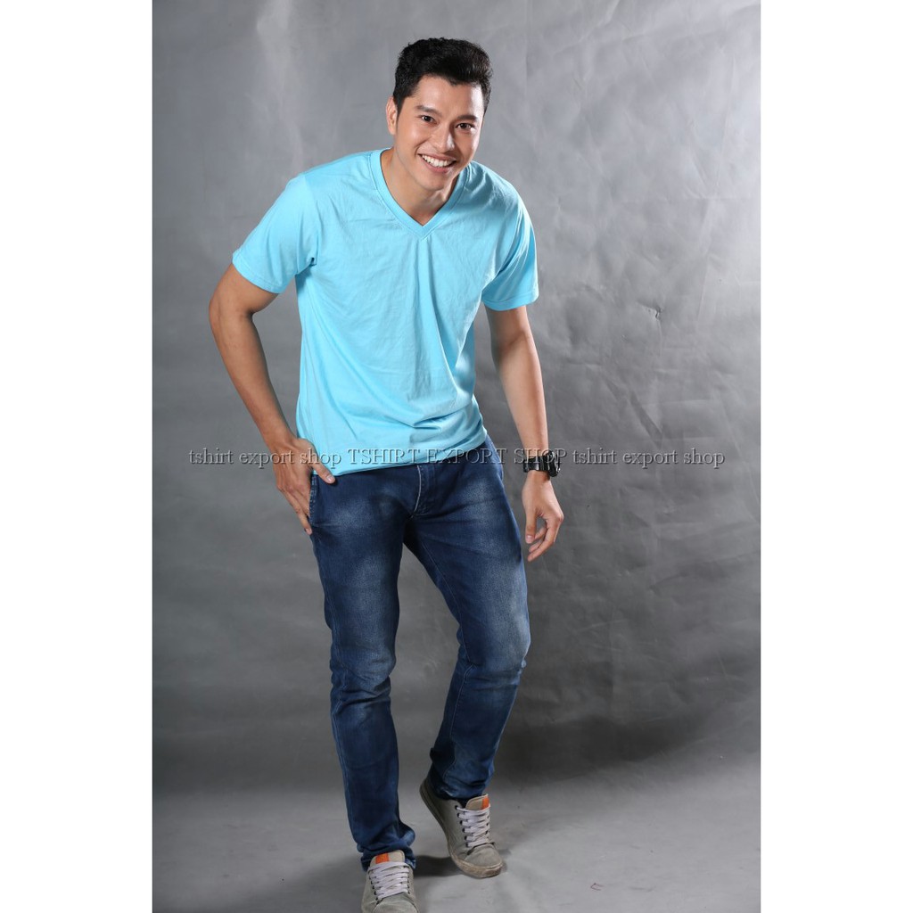 เสื้อยืด แฟชั่น ผู้ชาย ทรงตรง T-Shirt Cotton 100% คอวี แขนสั้น สีฟ้าอ่อน