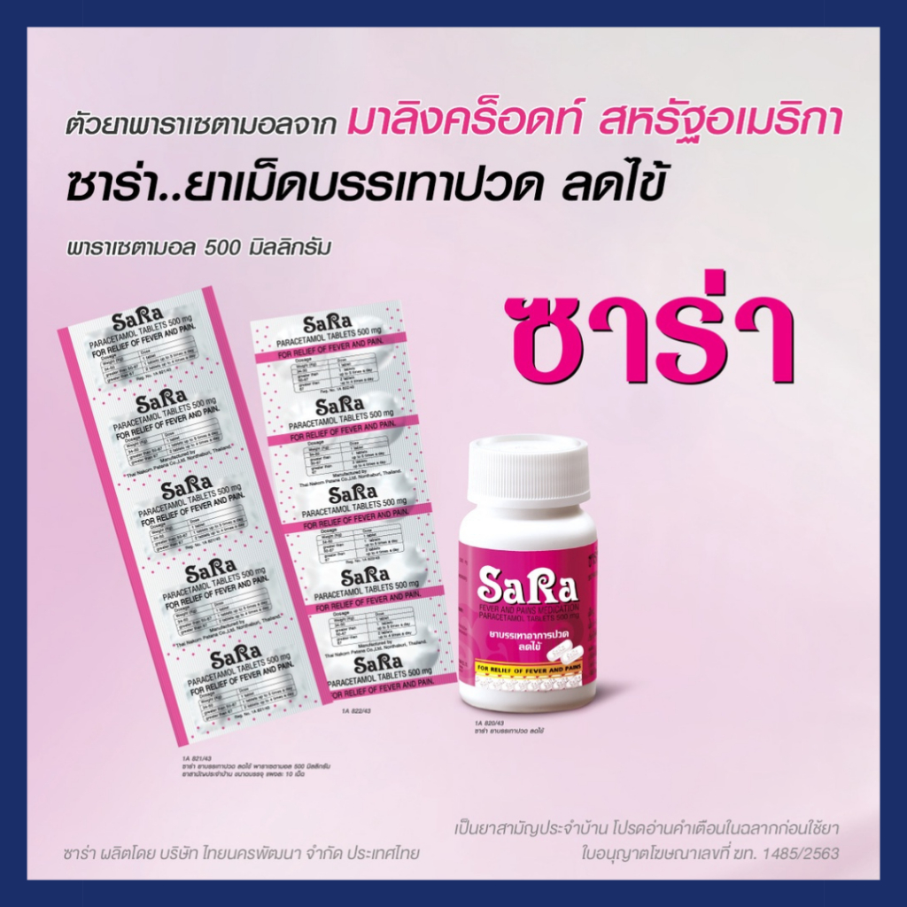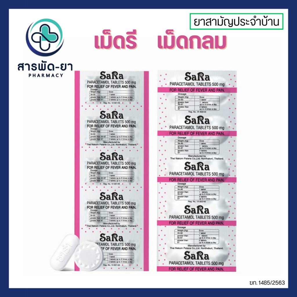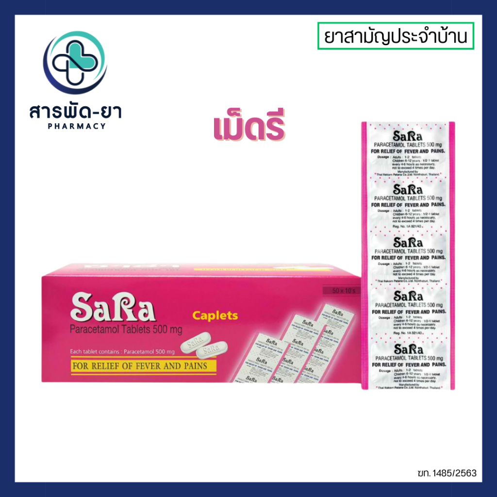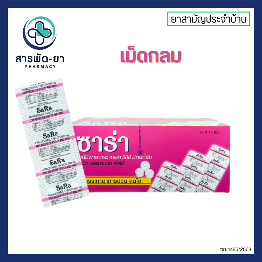 [กล่องละ 20 แผง] ซาร่า พาราเซตามอล Sara Paracetamol 500 มก เม็ดรี เม็ดกลม