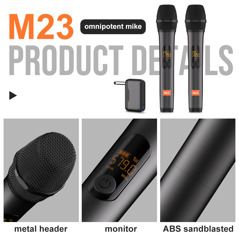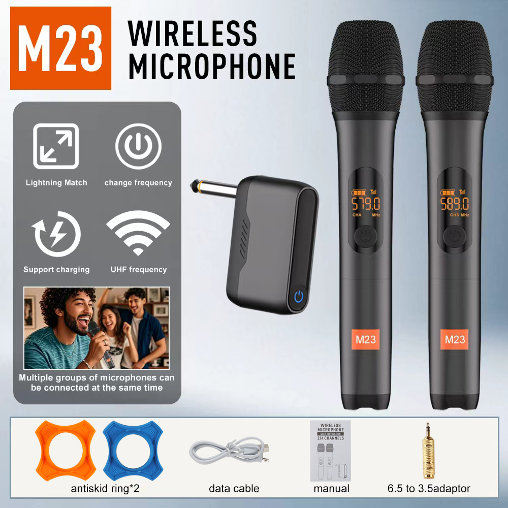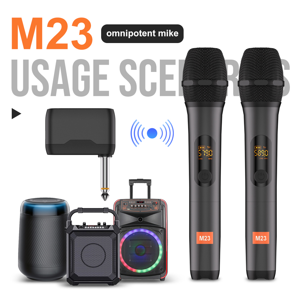 ไมโครโฟนไร้สาย UHF M23 พร้อมตัวรับสัญญาณแบบชาร์จไฟได้ 5 ชั่วโมงแบตเตอรี่ทํางานสําหรับคาราโอเ กะเวทีแสดงปาร์ตี้