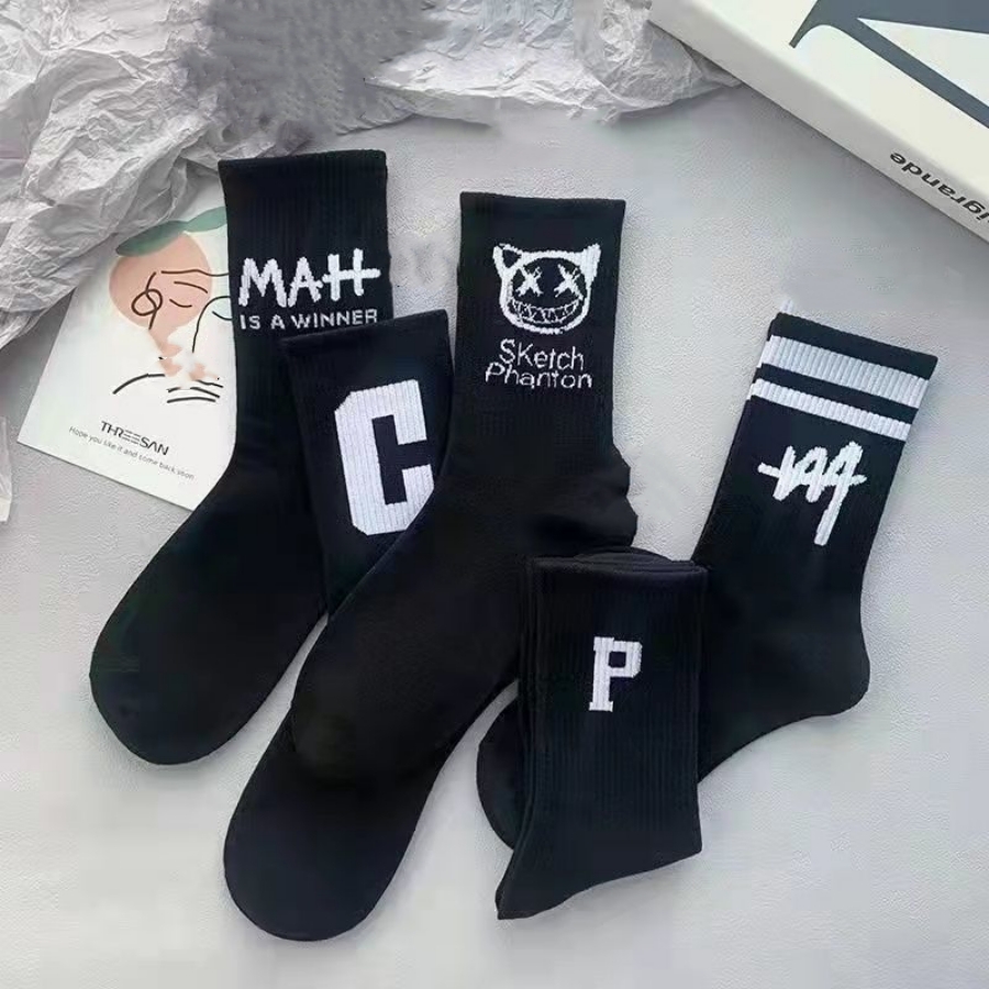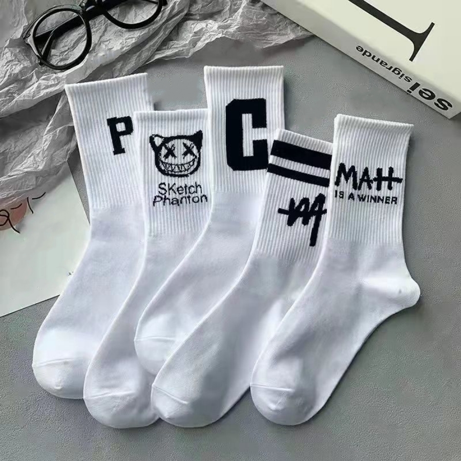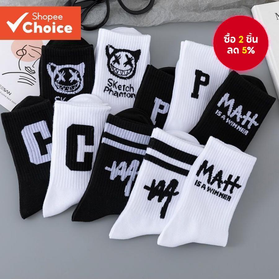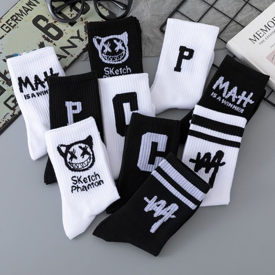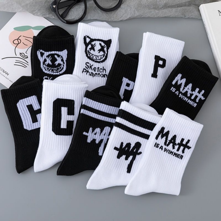 10คู่ผู้ชายกราฟิกกลางลูกเรือถุงเท้า-สีดํา/สีขาวพิมพ์การ์ตูน,สไตล์ สตรีทแวร์,ระบายอากาศสํา หรับเล่นกีฬาและลําล
