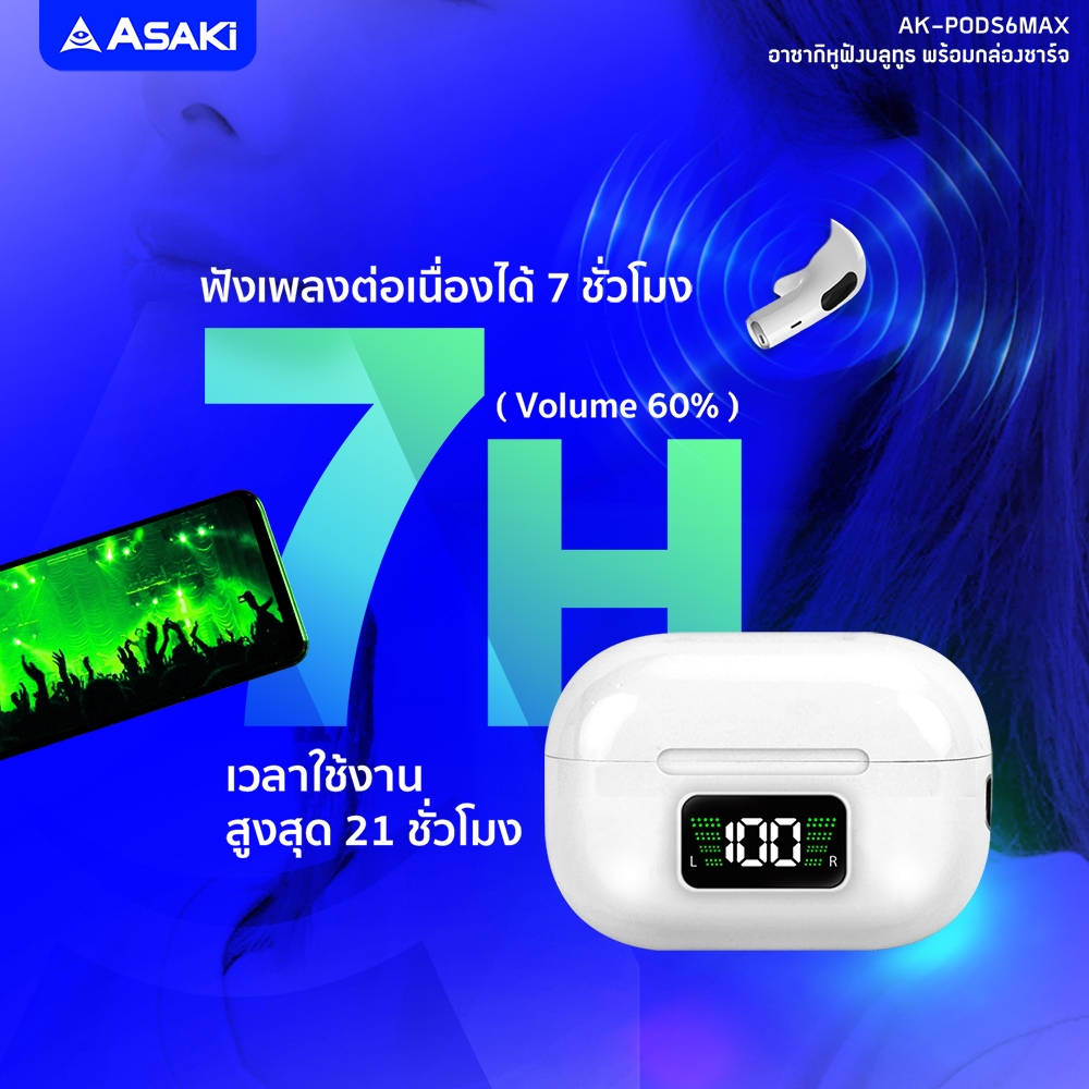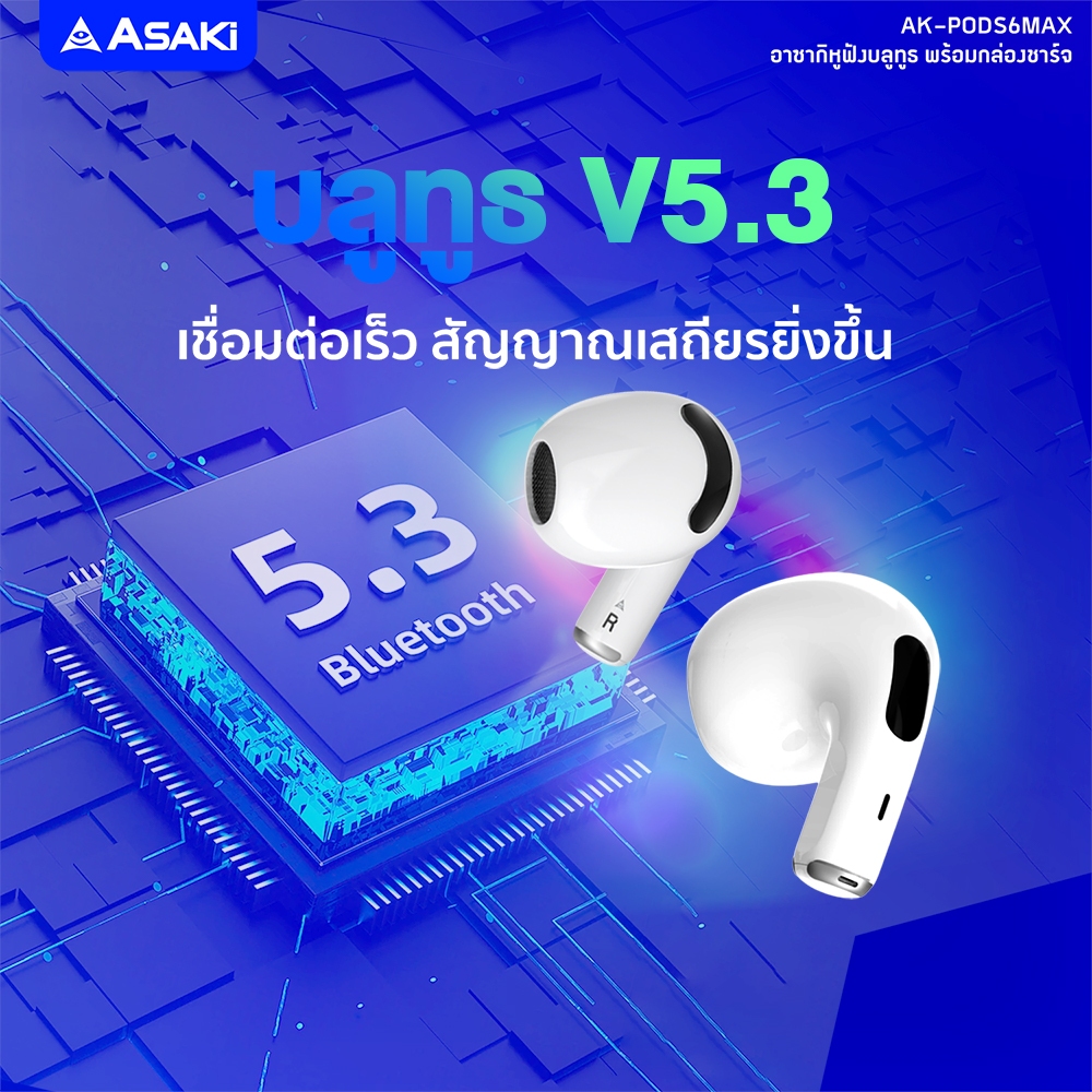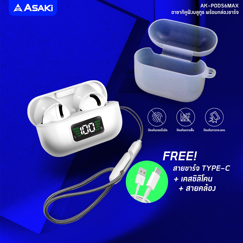 Asaki True Wireless หูฟังบลูทูธไร้สาย จอ LED ทัชสกรีน แบตใช้นาน 7 ชม. รุ่น AK-Pods6Max - ประกัน 1 ปี