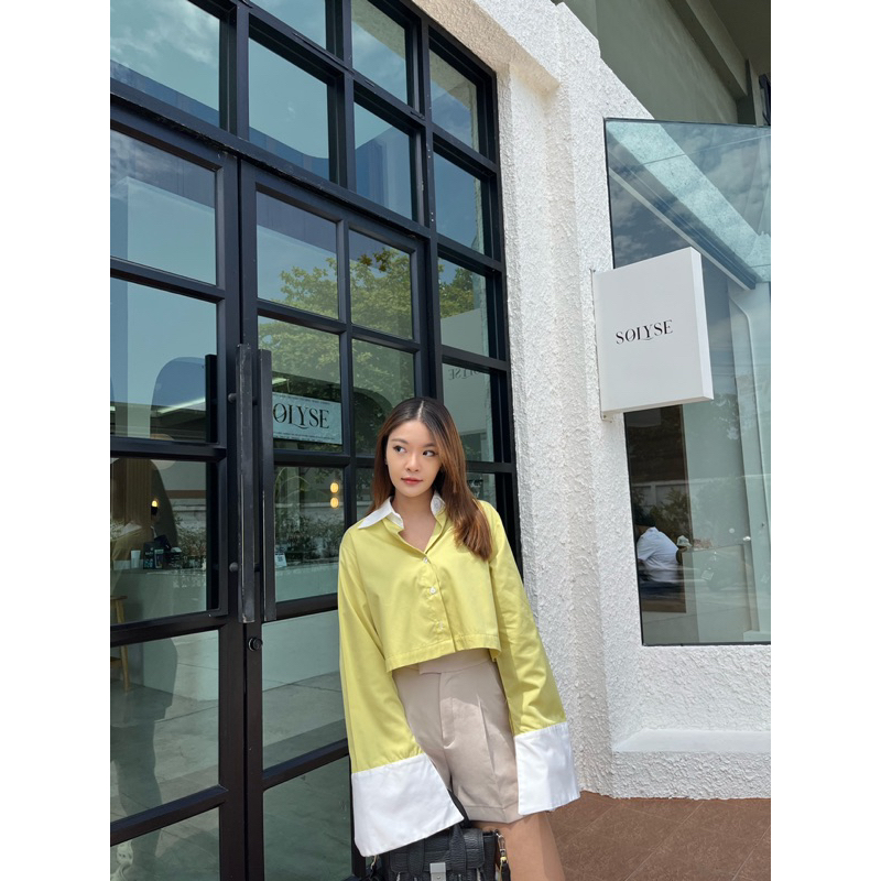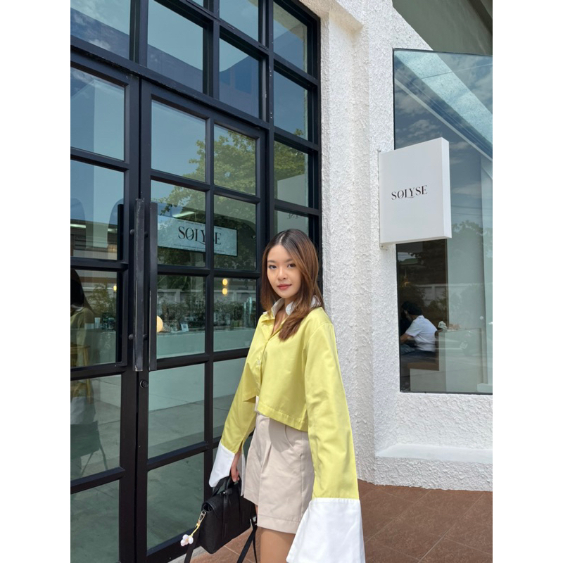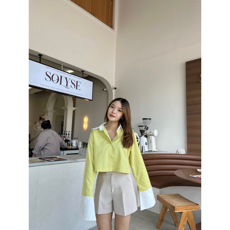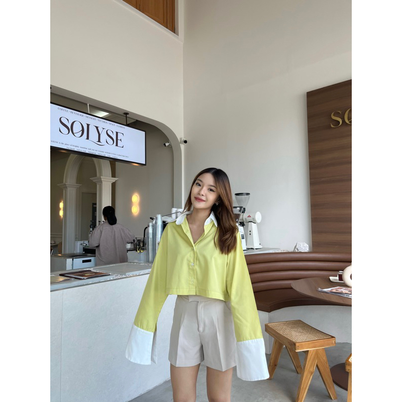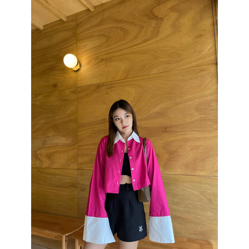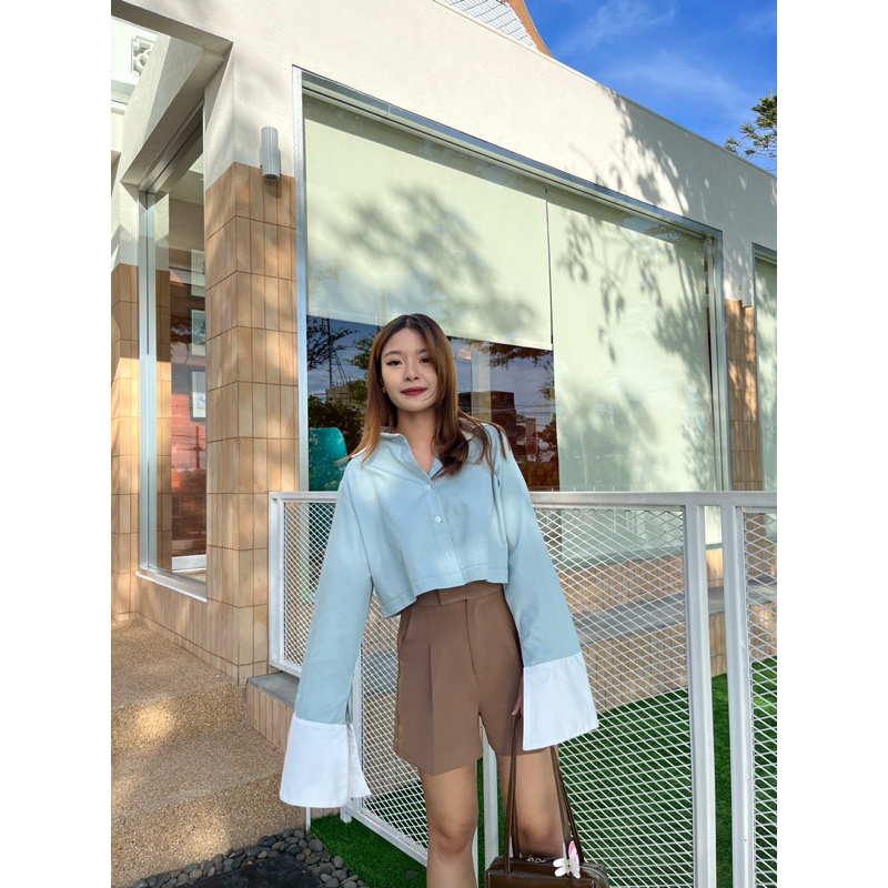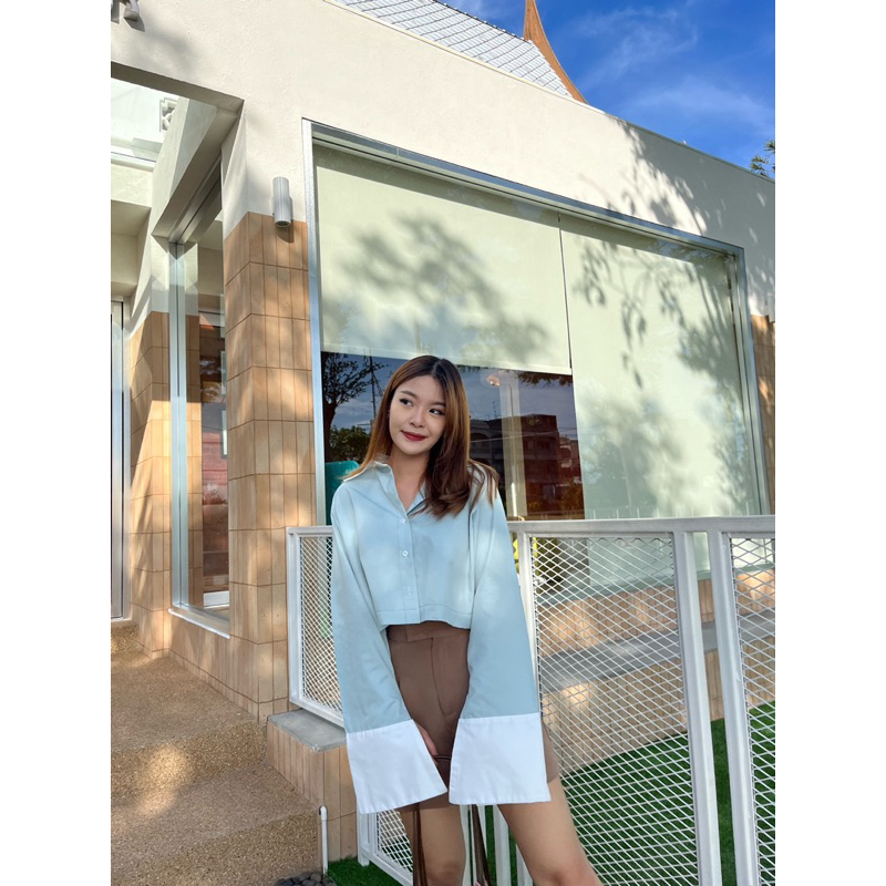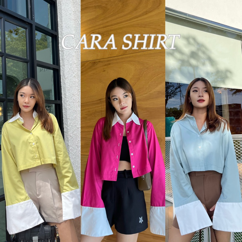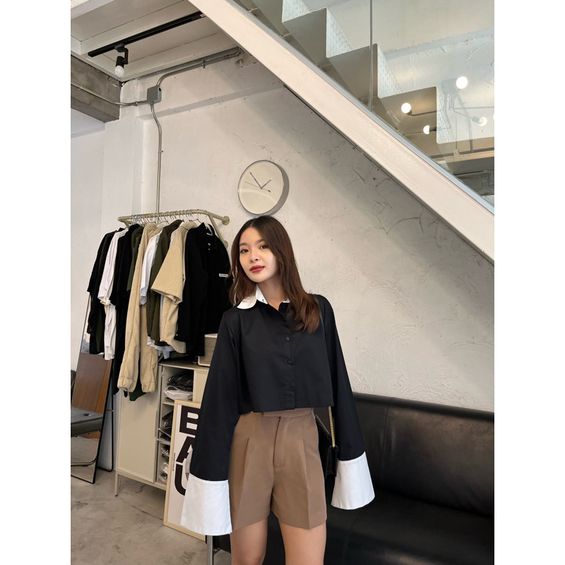 CARA SHIRT เสื้อเชิ้ตครอปแต่งปกขาว,ปลายแขนขาวแขนกระดิ่ง (nita.bkk)