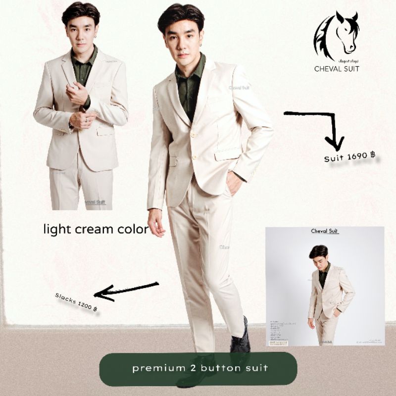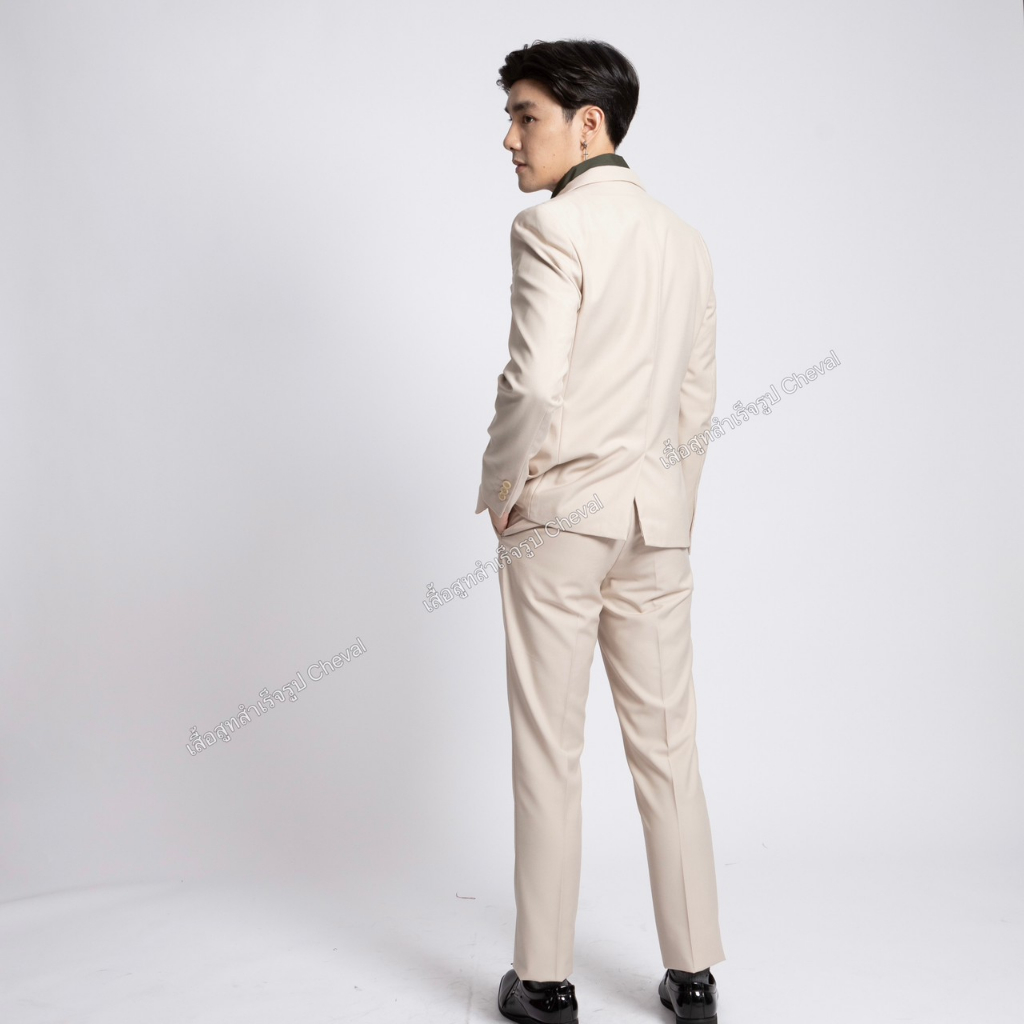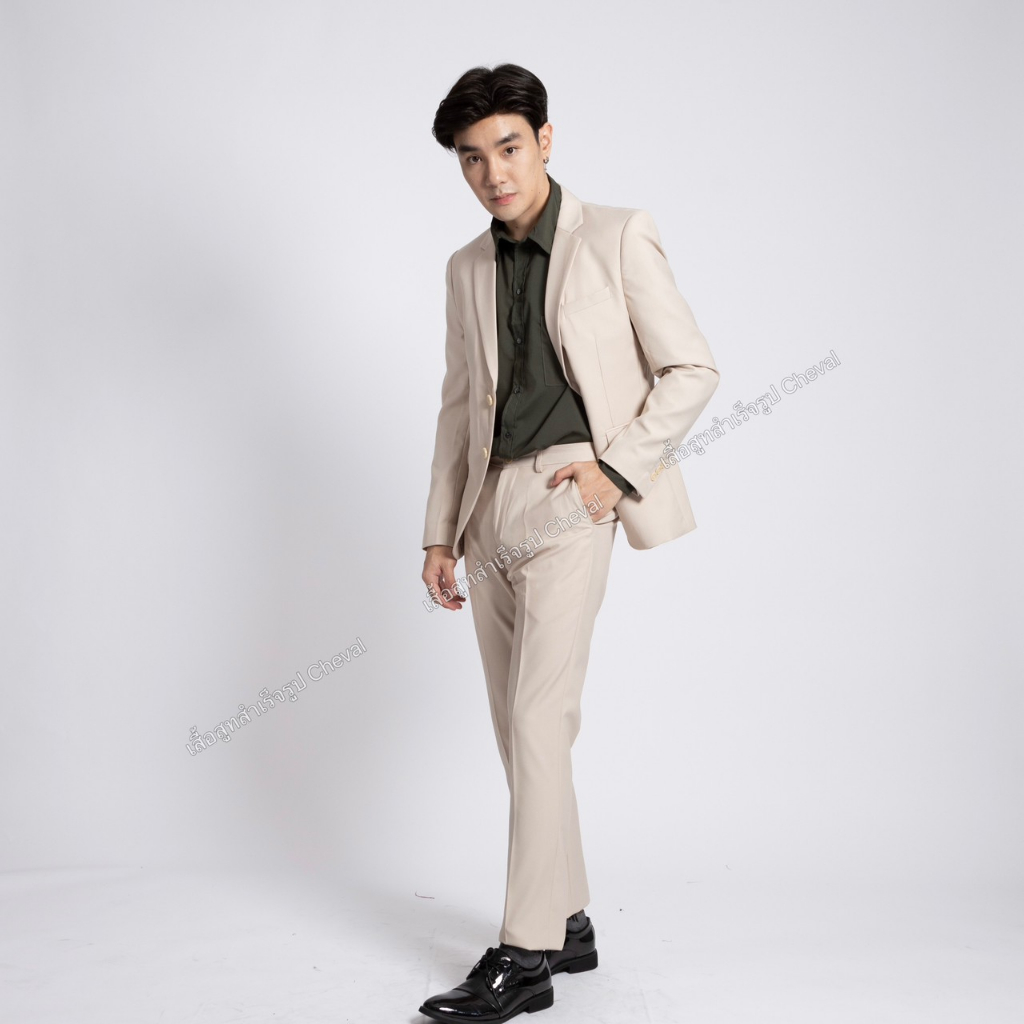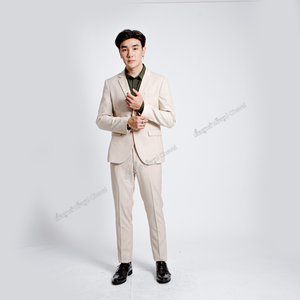 ชุดสูทผู้ชายสีครีมอ่อน เสื้อ+กางเกงรุ่นพรีเมี่ยม 2 กระดุม สูทผู้ชายใส่ทำงาน สูทใส่ออกงาน พร้อมส่ง รูปถ่ายจากสินค้าจริง