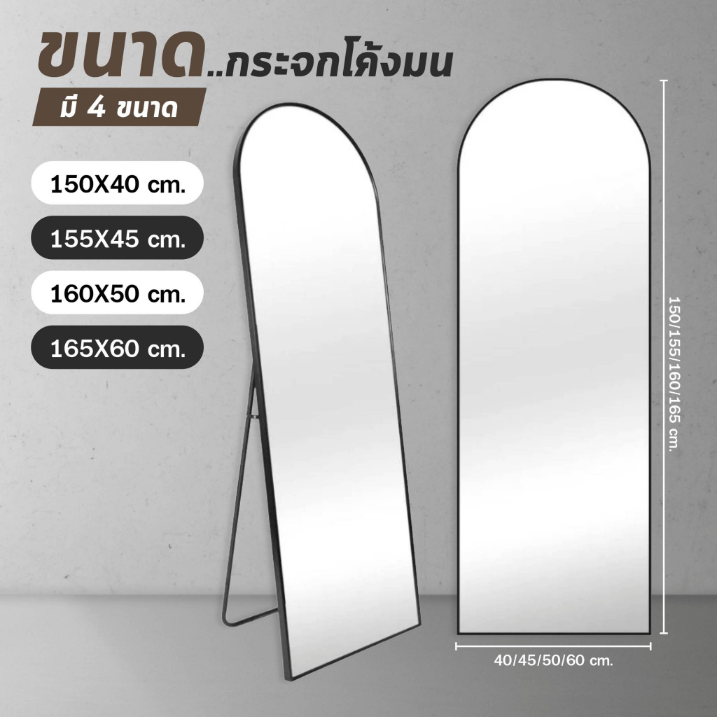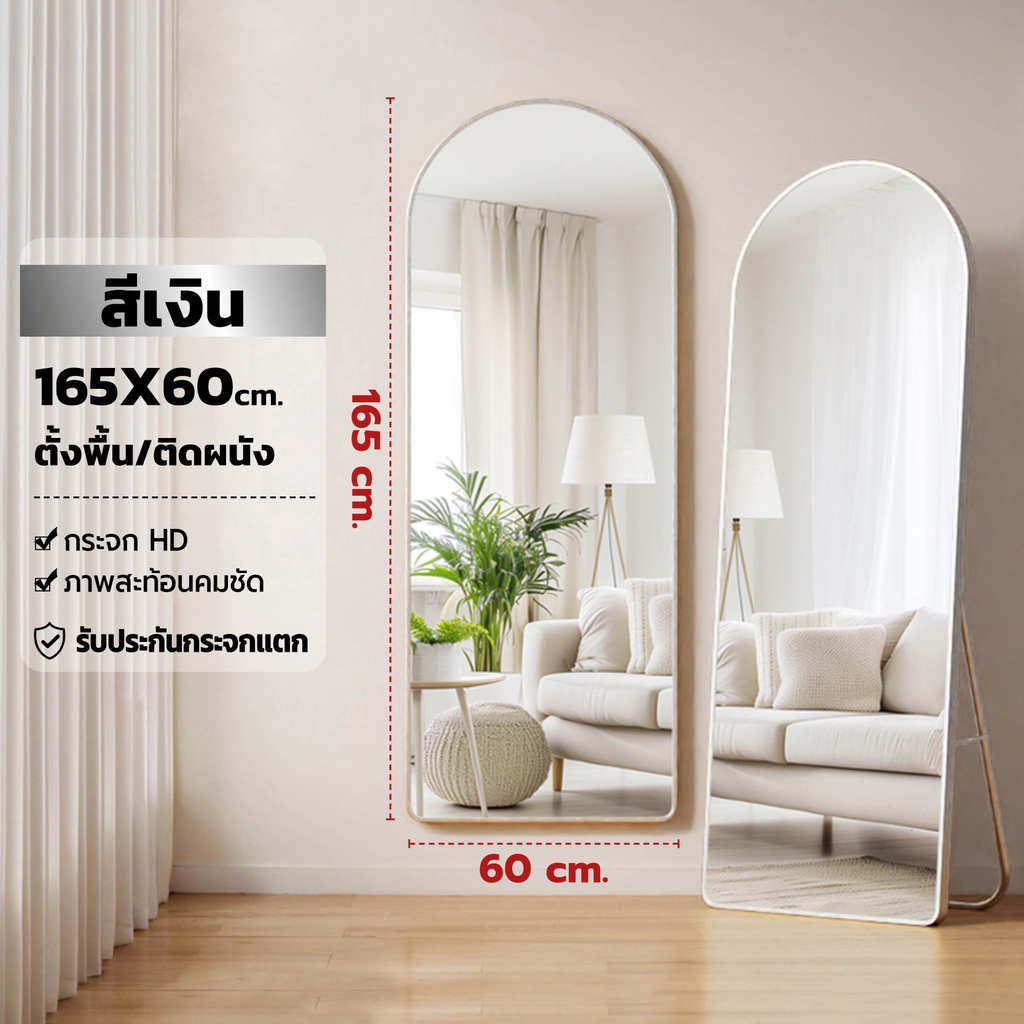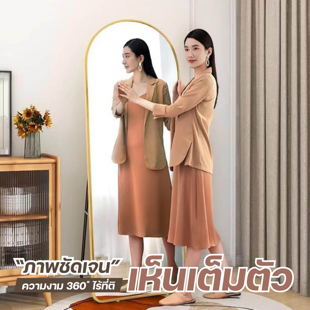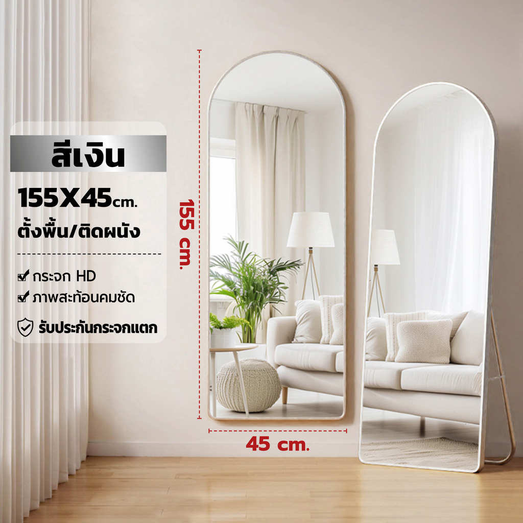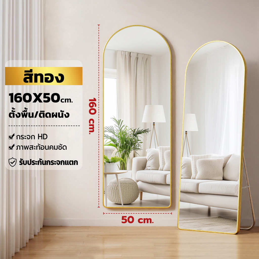 【ขนาดใหญ่ 】กระจกเต็มตัวโค้งมน กระจกยาว ตั้งพื้น กรอบแคบ 150-165CM มีขาตั้งพื้นได้ แขวนผนังได้ ไม่ต้องประกอบ ประกันแตก