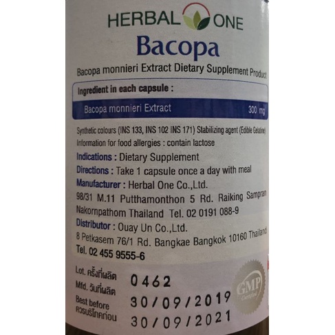 Herbal One Bacopa พรมมิ 60 แคปซูล 1 กระปุก พรมมิ สารสกัดจากต้นพรมมิ