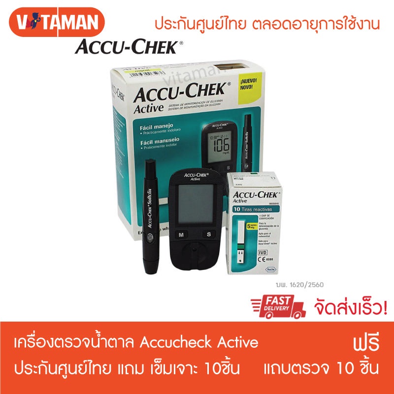 Accuchek Active เครื่องตรวจน้ำตาล แถมเข็มเจาะปลายนิ้ว 10ชิ้น แถบตรวจ10 ชิ้น ประกันศูนย์ไทย