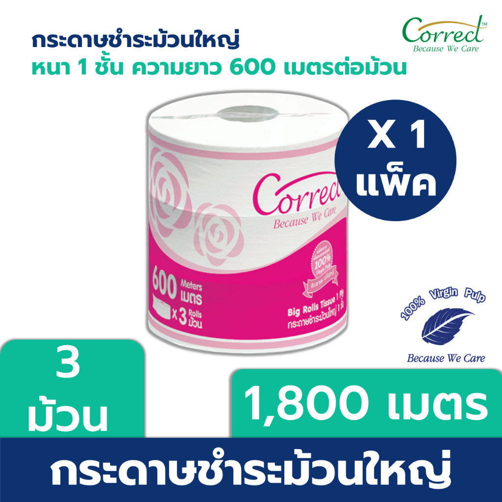 Correct กระดาษชำระม้วนใหญ่ หนา 1 ชั้น ความยาว 600 เมตร บรรจุ 3 ม้วน/แพ็ค (1,800 เมตร)