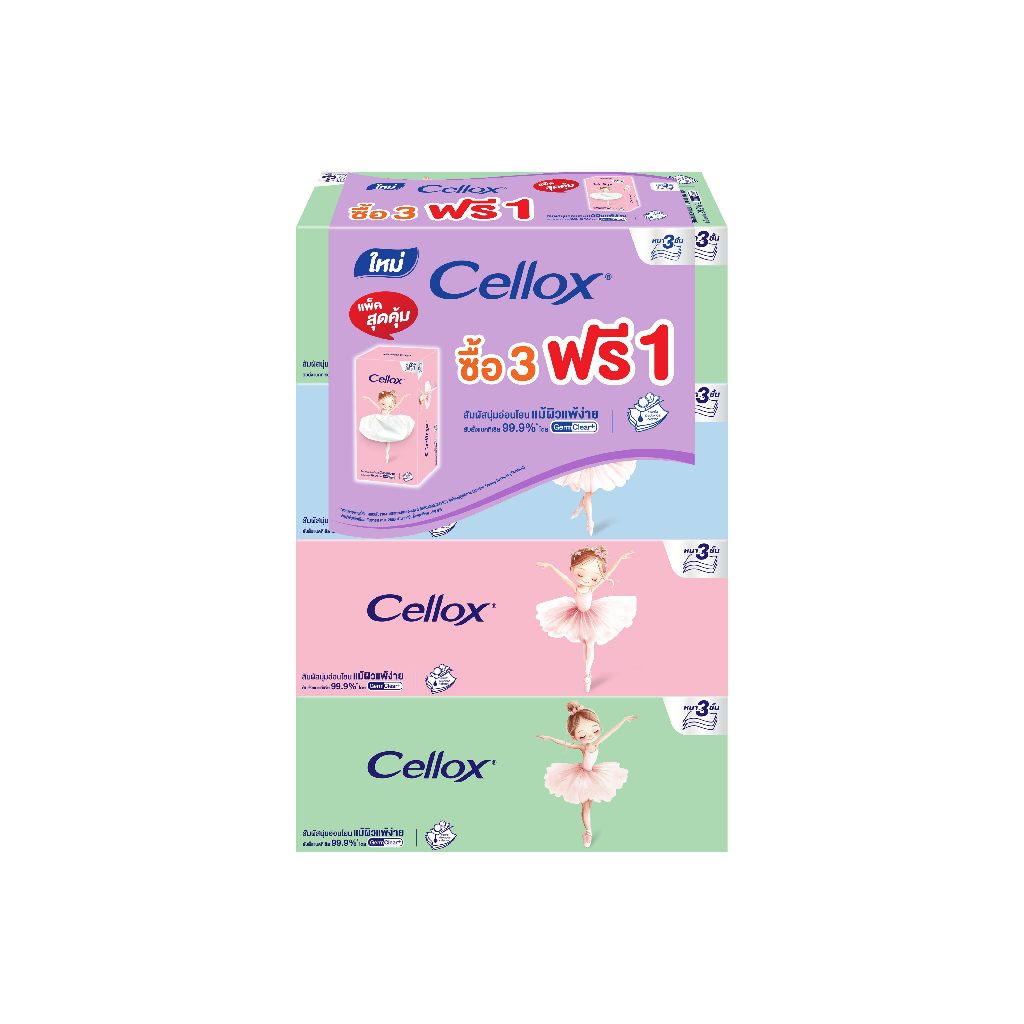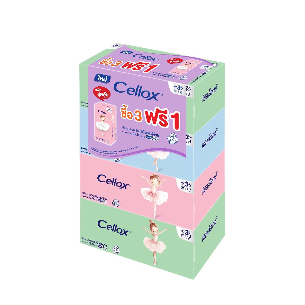 Cellox Facial 3ply Trendy Box P.3+1 เซลล็อกซ์ กระดาษเช็ดหน้า 3 ชั้น เทรนดี้ แบบกล่อง 80 แผ่น แพ็ก 3+1
