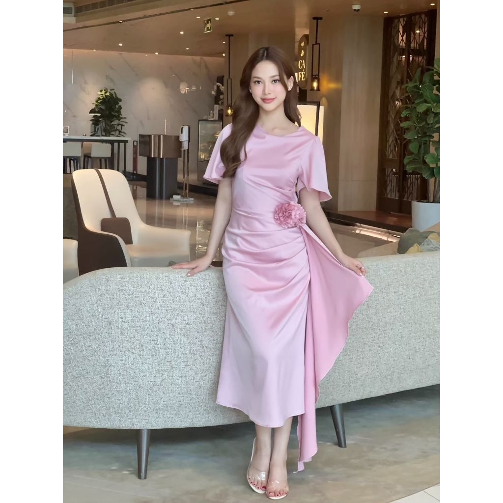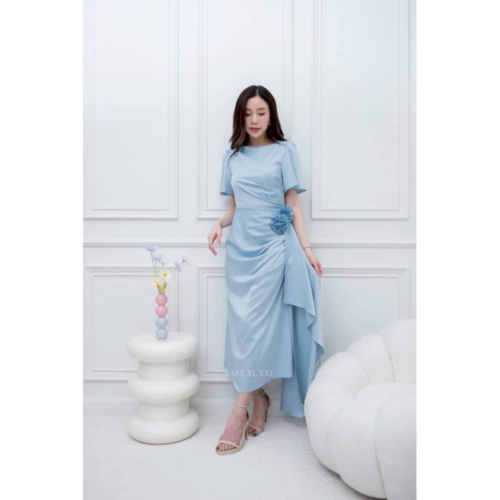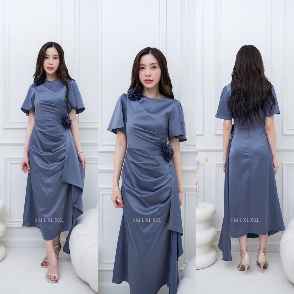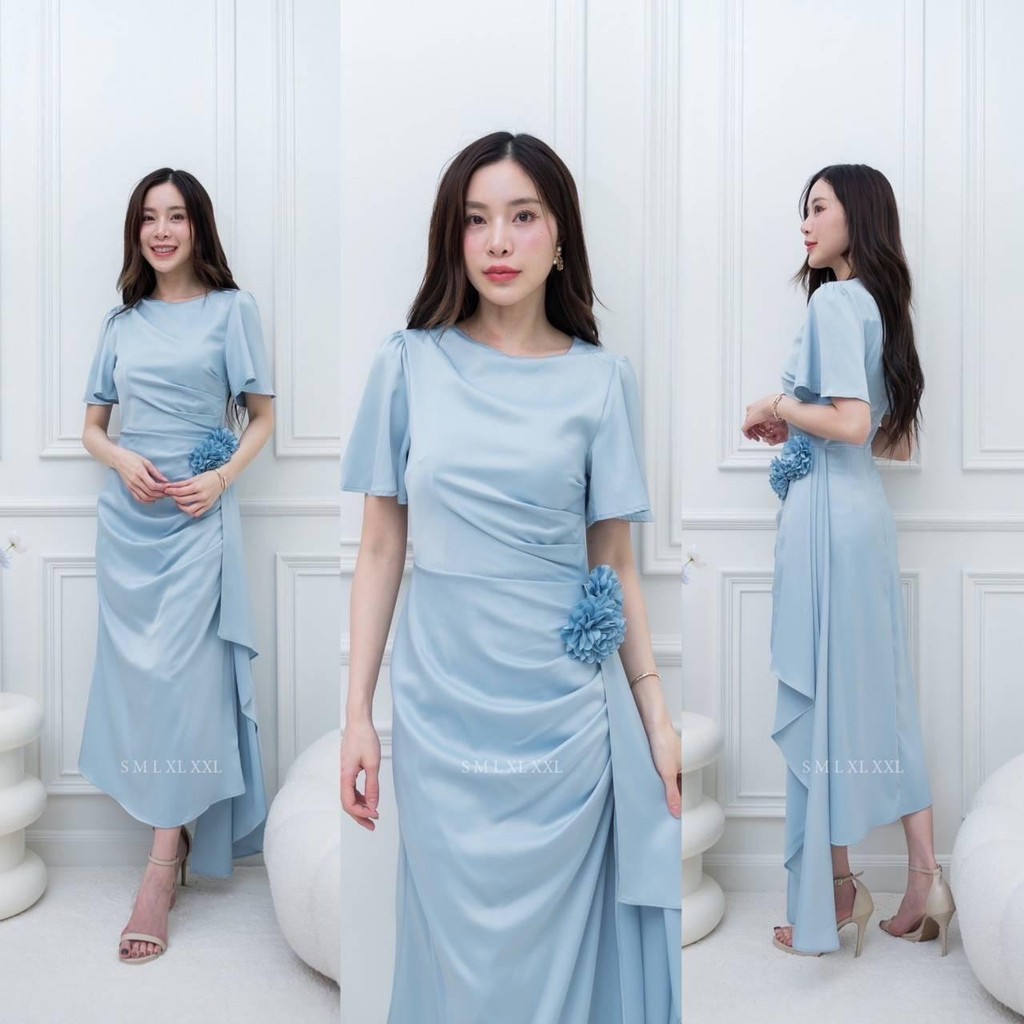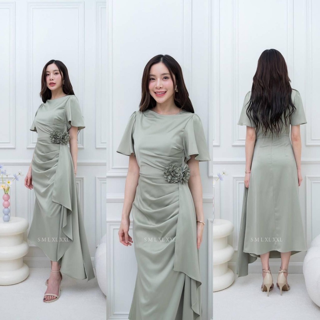 ชุดออกงาน เดรสสวยๆ TP039 ชุดไปงาน ผ้าเครปซาติน คอกลม สไบข้างกระโปรง ซับใน ซิปหลัง เดรสยาว ผู้หญิง เสื้อผ้า Lady Dresses