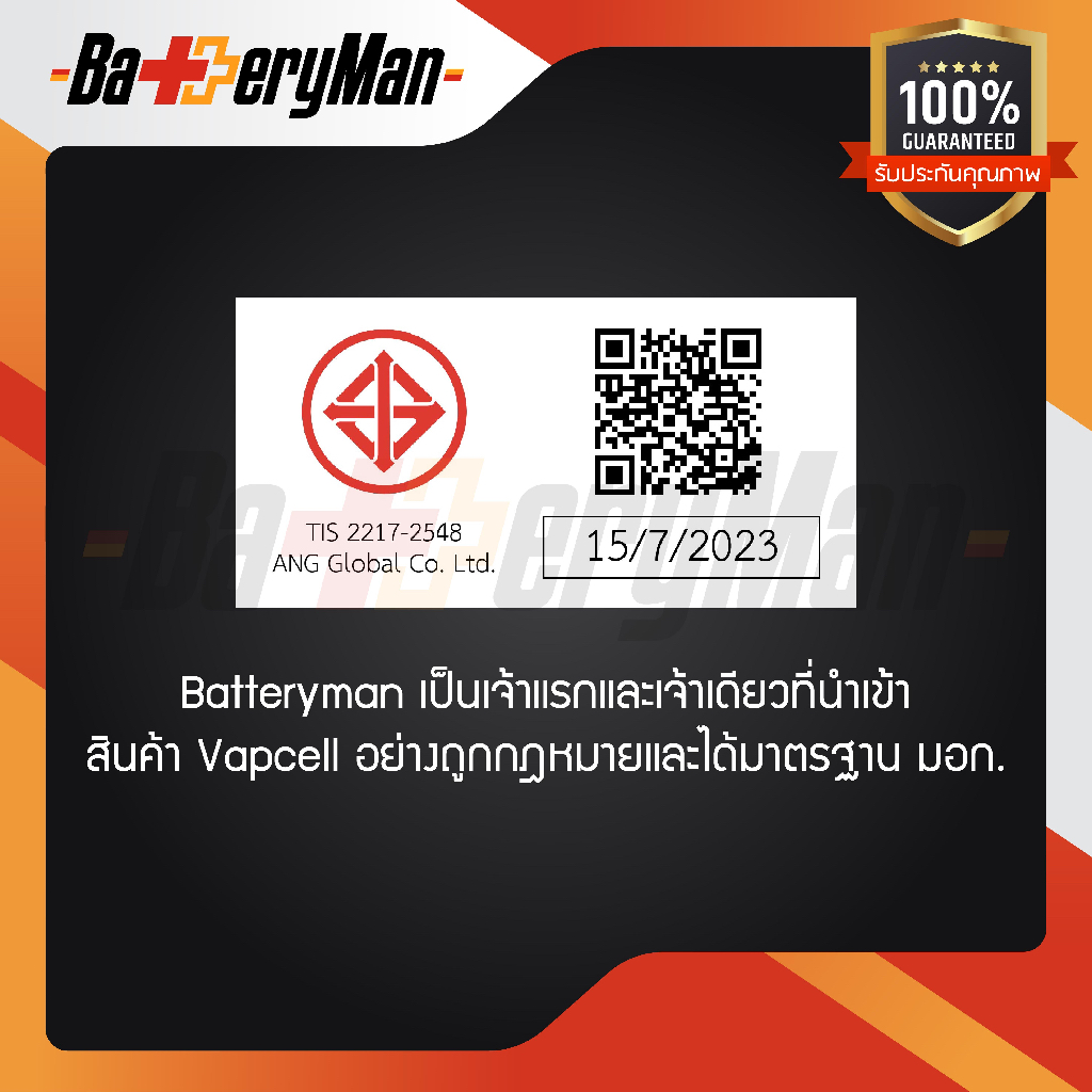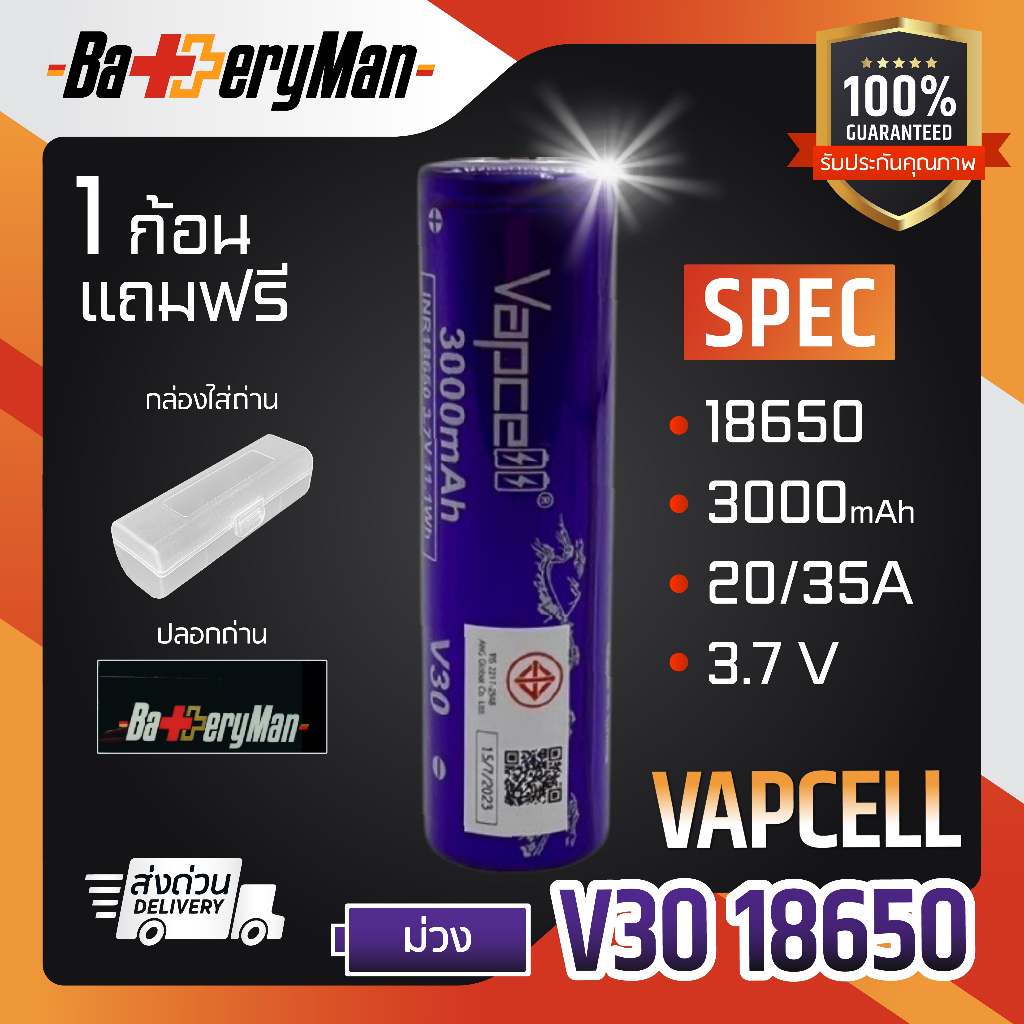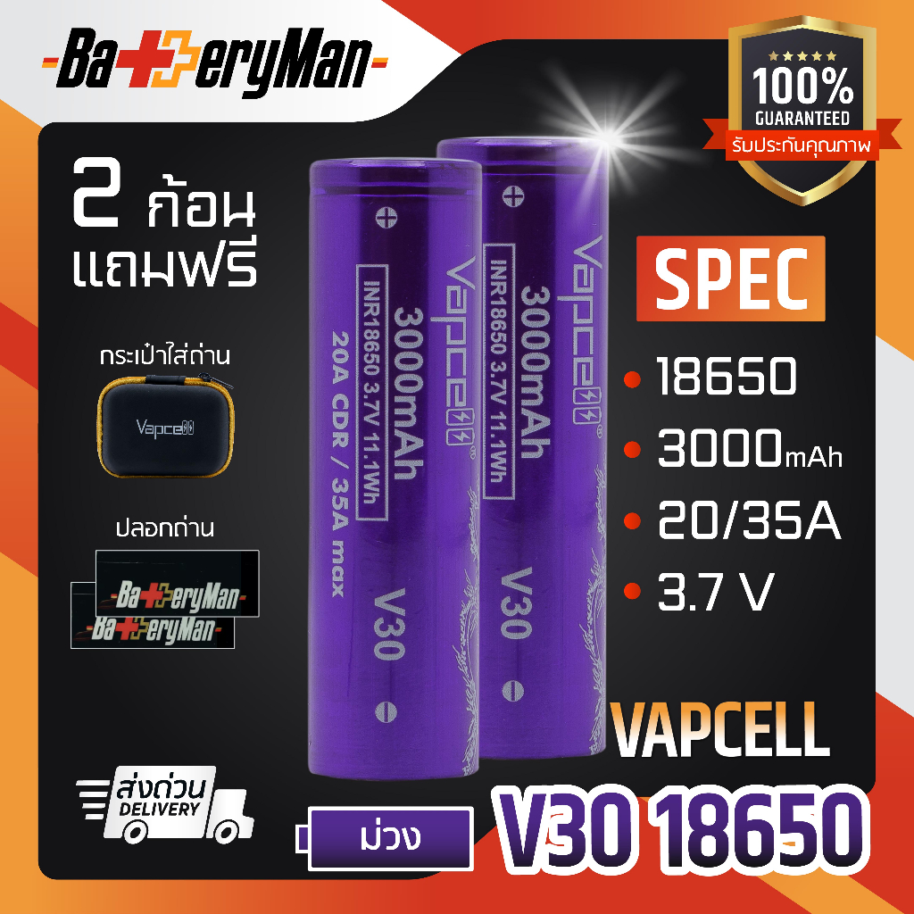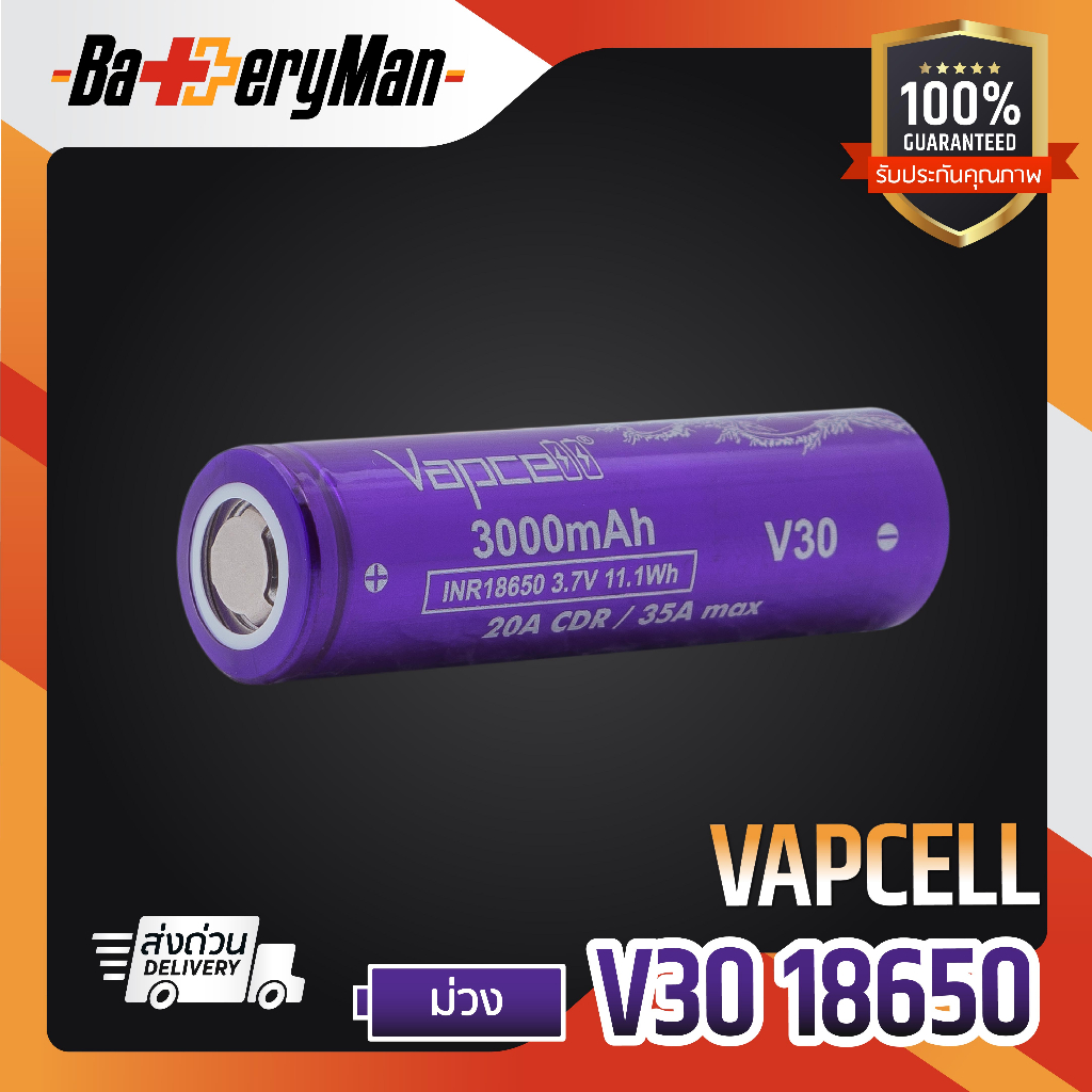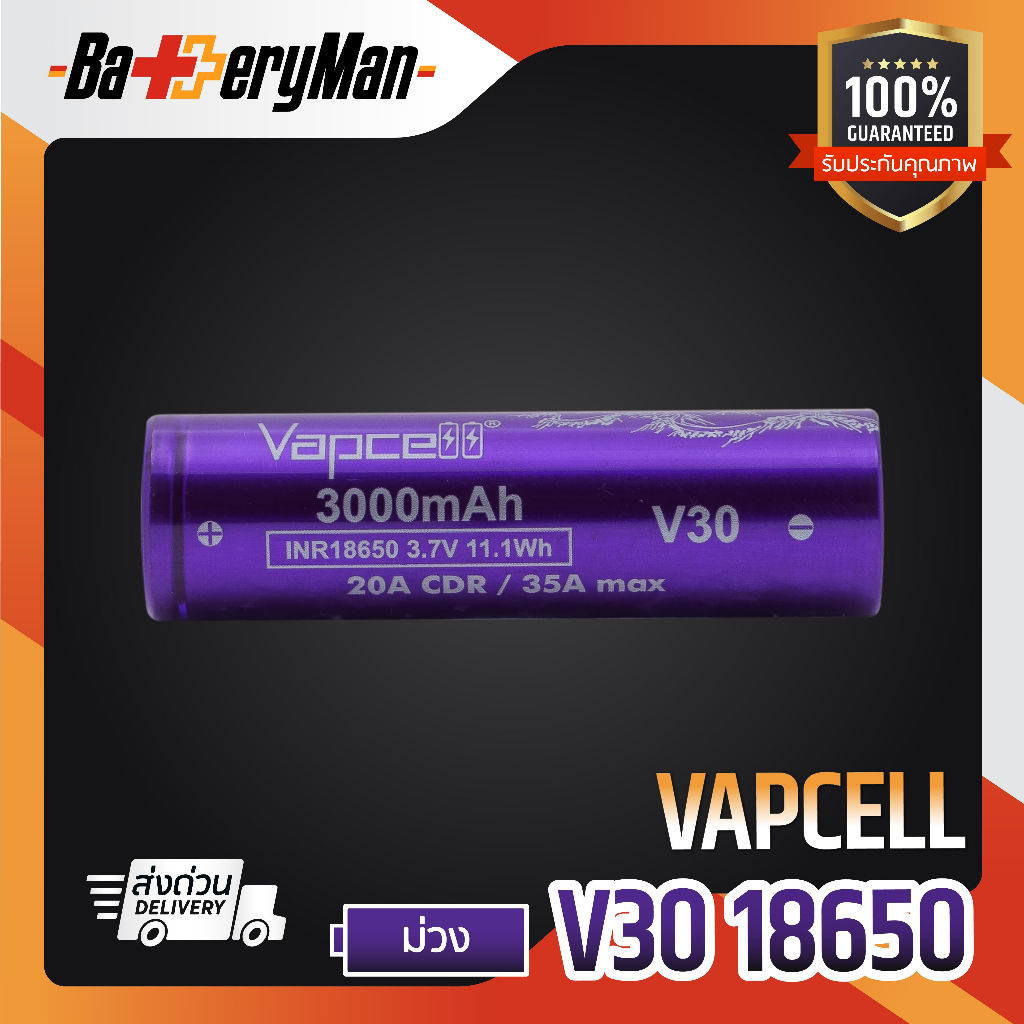 (มี มอก.)(เเท้100%) ถ่านชาร์จ Vapcell 18650 ม่วง 3000mAh 20A/35A (ร้านbatteryman)