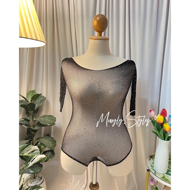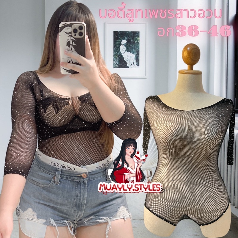 ✨พร้อมส่ง✨ บอดี้สูทตาข่ายเพชรสาวอวบอก32-46