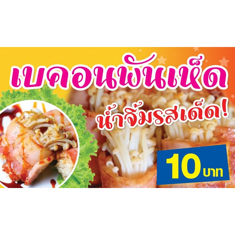ป้ายไวนิลร้านเบคอนพันเห็ด ขนาด 60x100cm (เย็บเจาะตาไก่ 4 มุม) แก้ไขข้อความได้ตามเหมาะสม เพิ่มเบอร์โทรศัพท์ได้ค่ะ