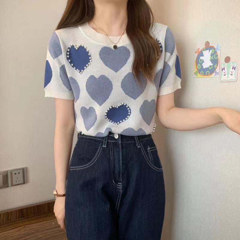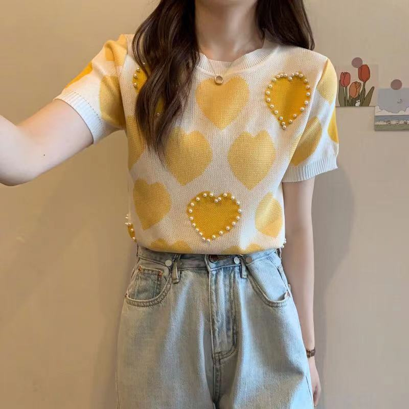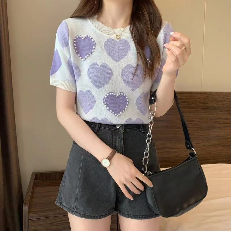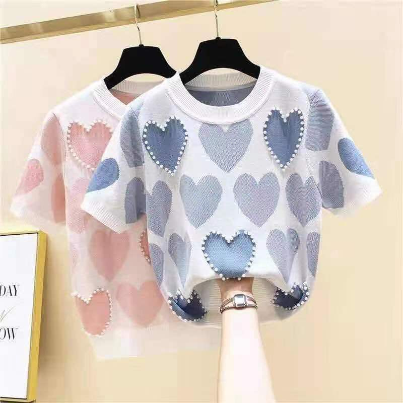 ♦️♦️💕เสื้อไหมพรม แขนสั้น คอกลมไม่ลึก ปักมุก ผ้านิ่ม ใส่สบาย51025 *