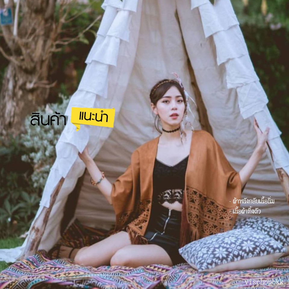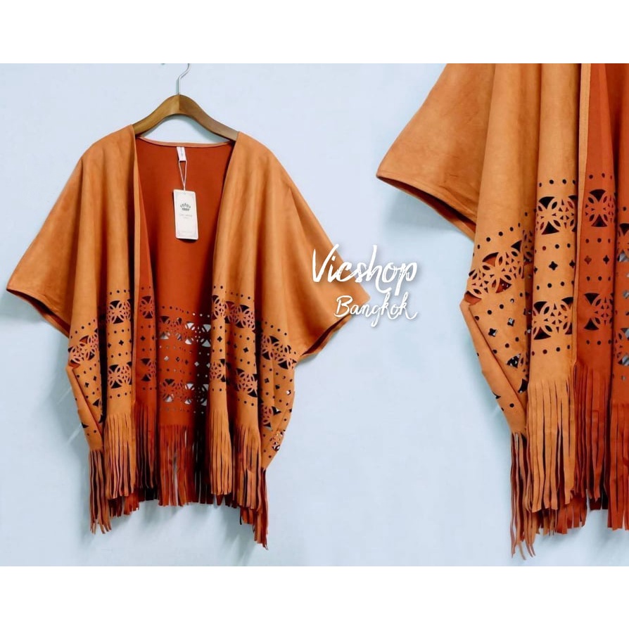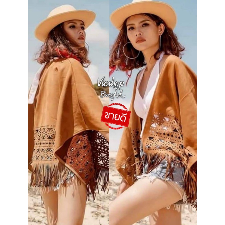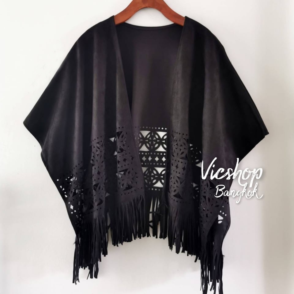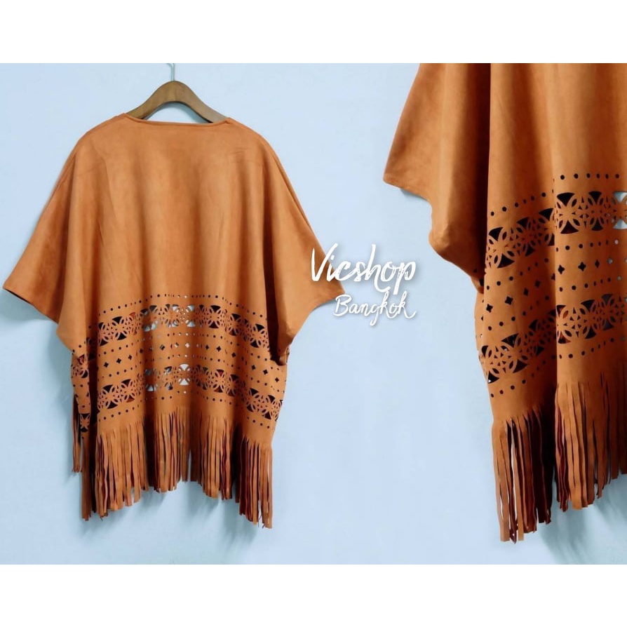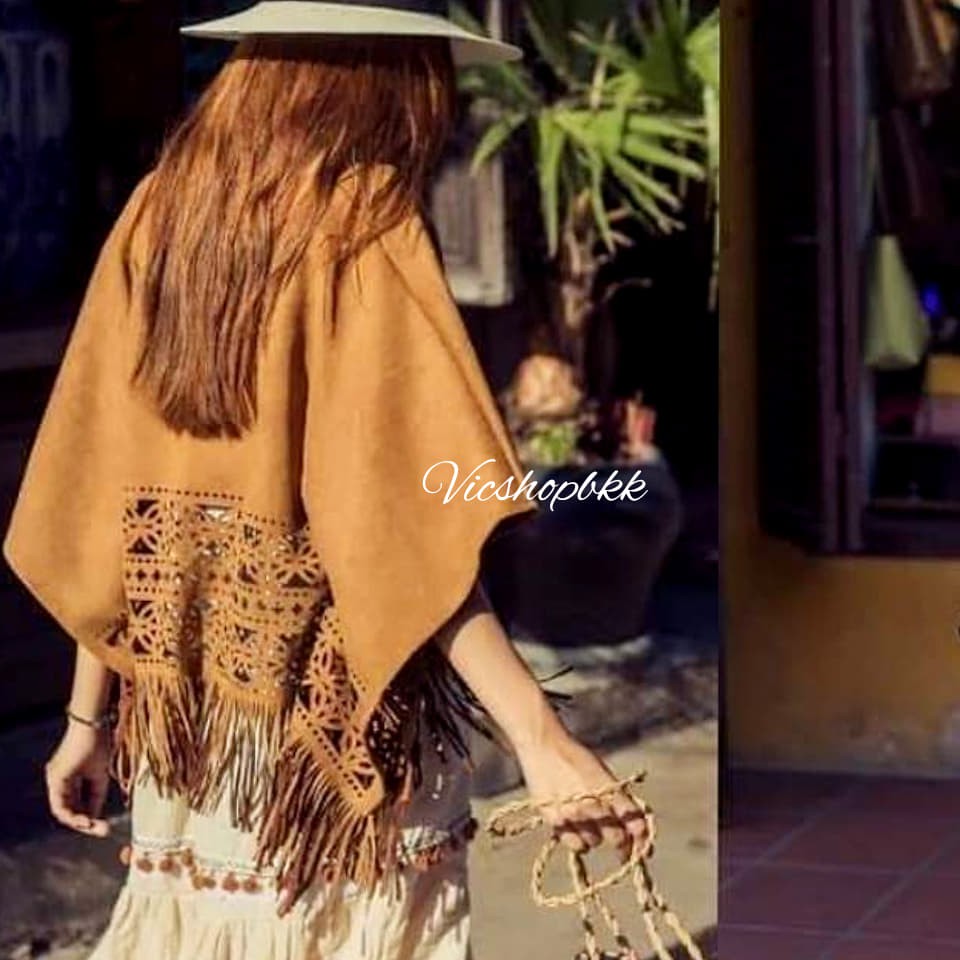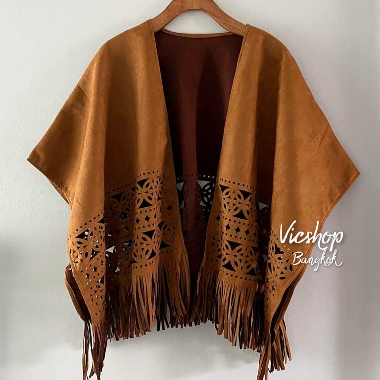 Bohemian Top : เสื้อคลุมโบฮีเมียนชนเผ่า เสื้อคลุมคาวบอย ผ้าหนังกลับฉลุลายทรงค้างคาว ชายพู่ (unisex)