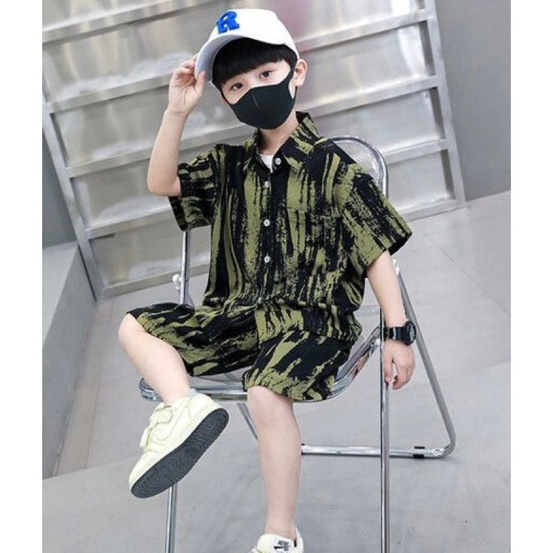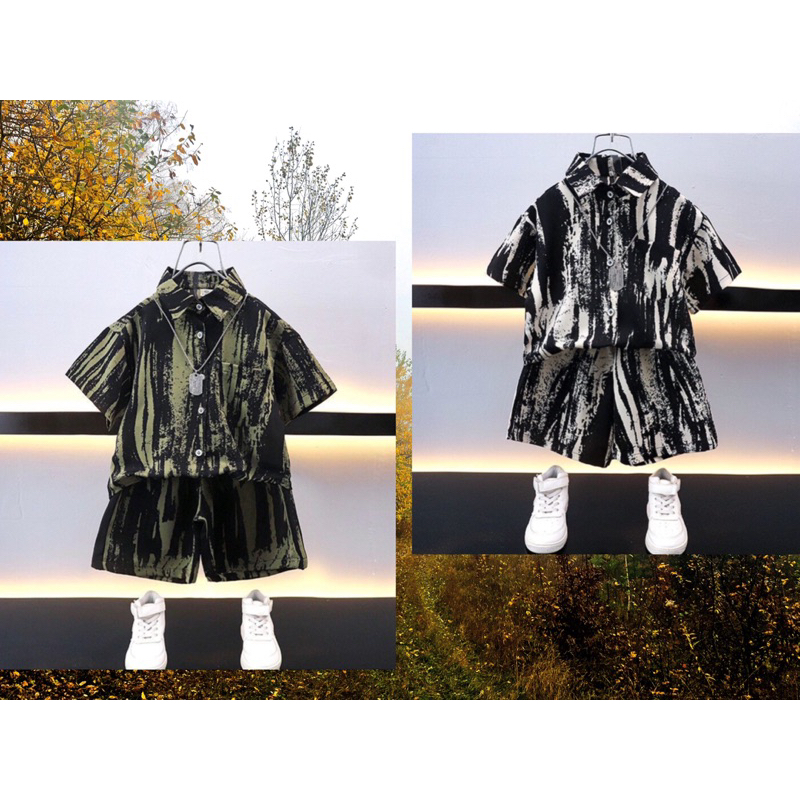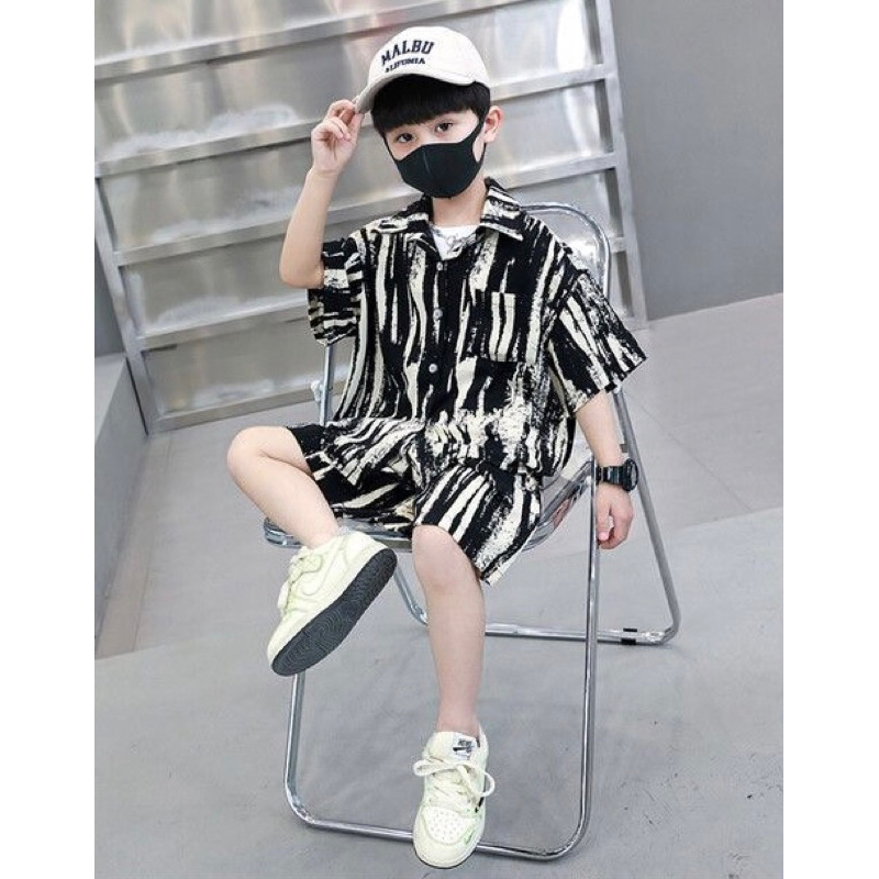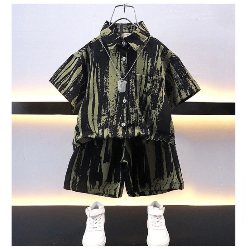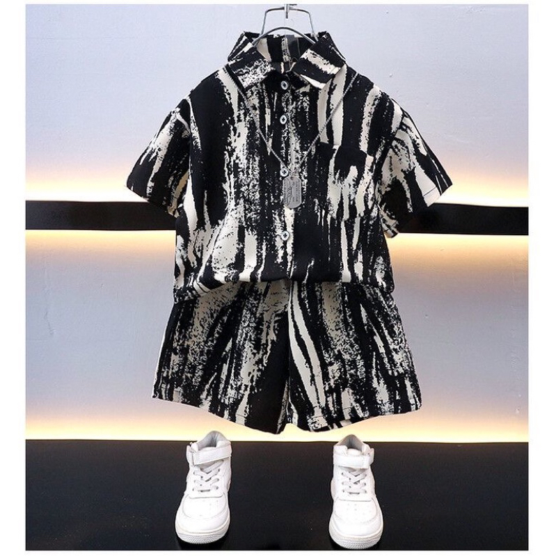 🇹🇭พร้อมส่งในไทย🇹🇭ชุดเซ็ทเด็กผู้ชายชุดเด็กลายหินอ่อน ชุดเสื้อคอปกกระดุมหน้าพร้อมกางเกง ชุดเซ็ต2ชิ้น