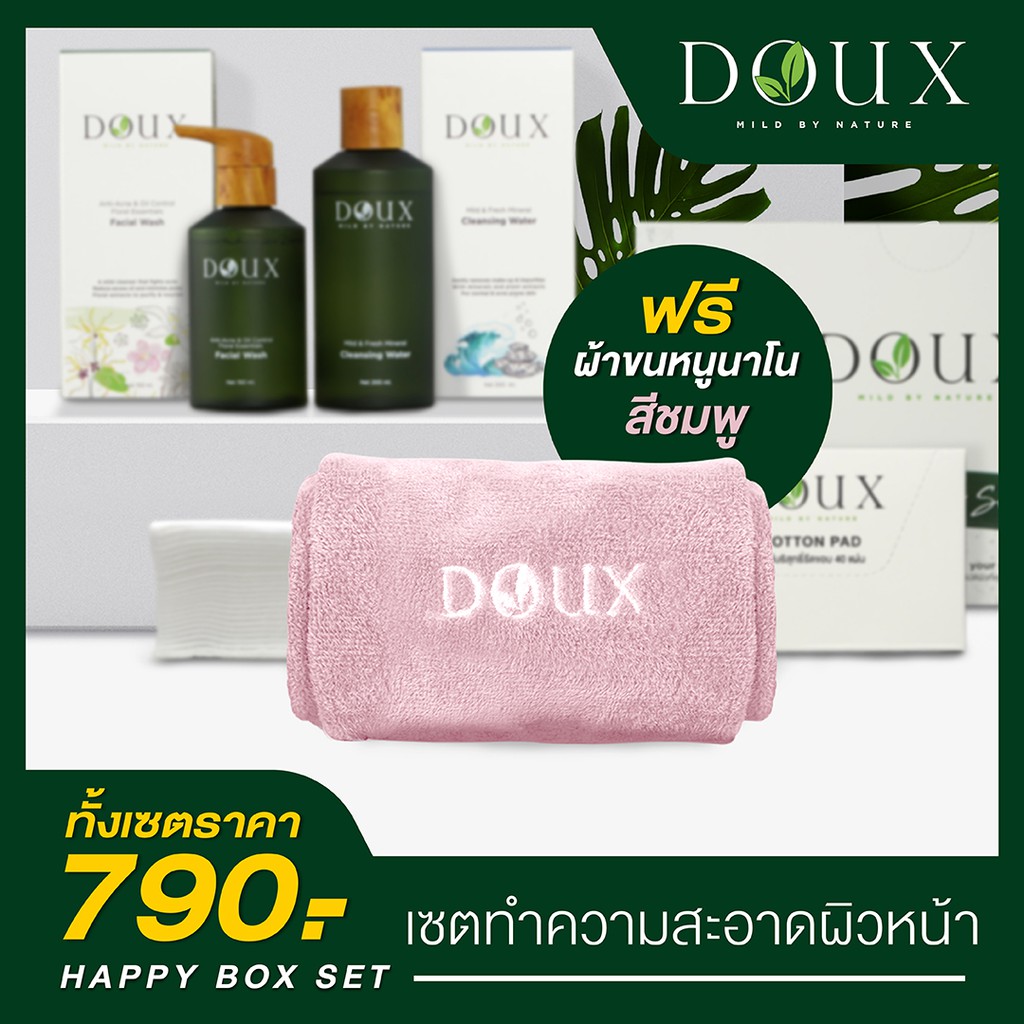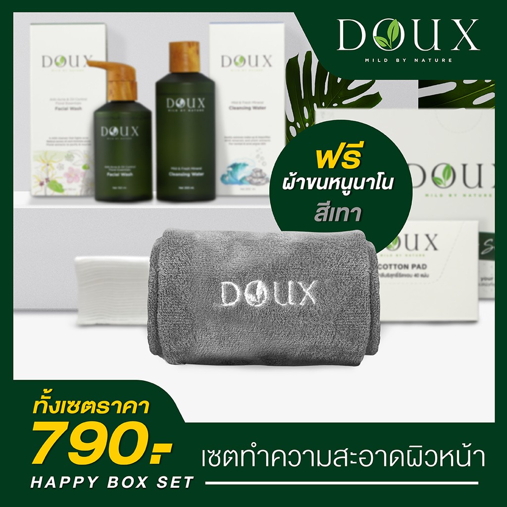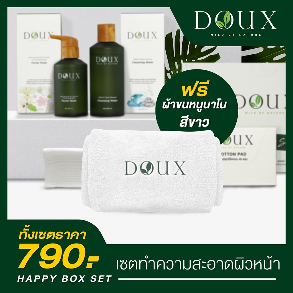 DOUX (ดูซ) Happy Box Set เซ็ตทำความสะอาดผิวหน้าครบวงจร (คลีนซิ่ง+เจลล้างหน้า+ผ้าขนหนูนาโน+สำลี) ส่งฟรี !!