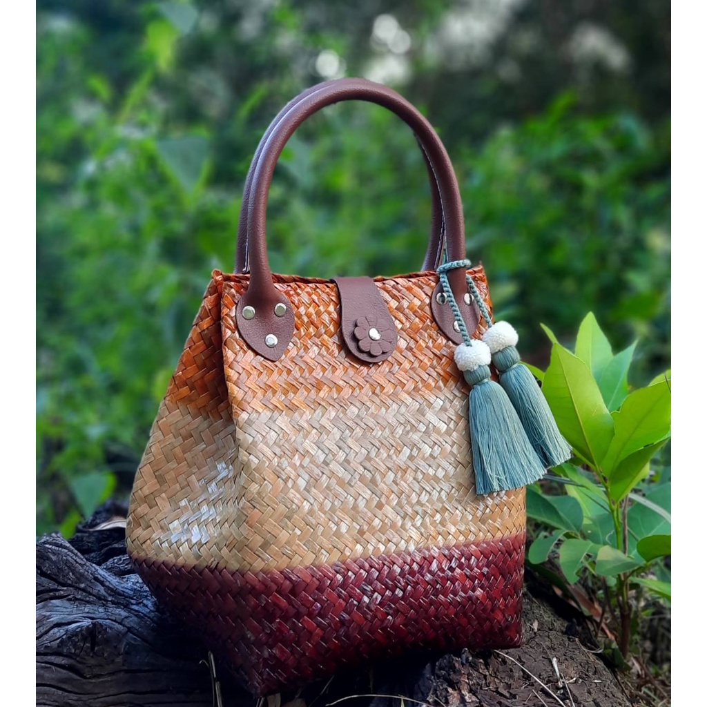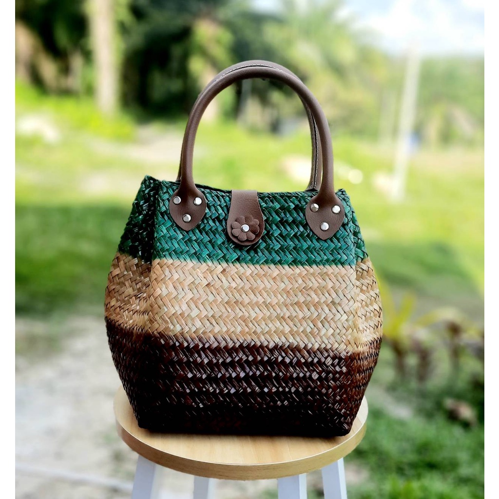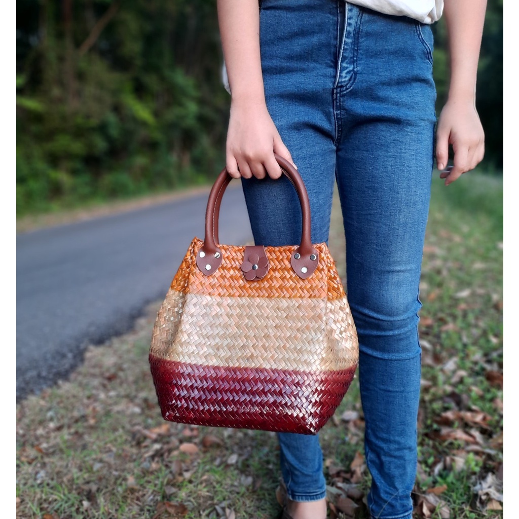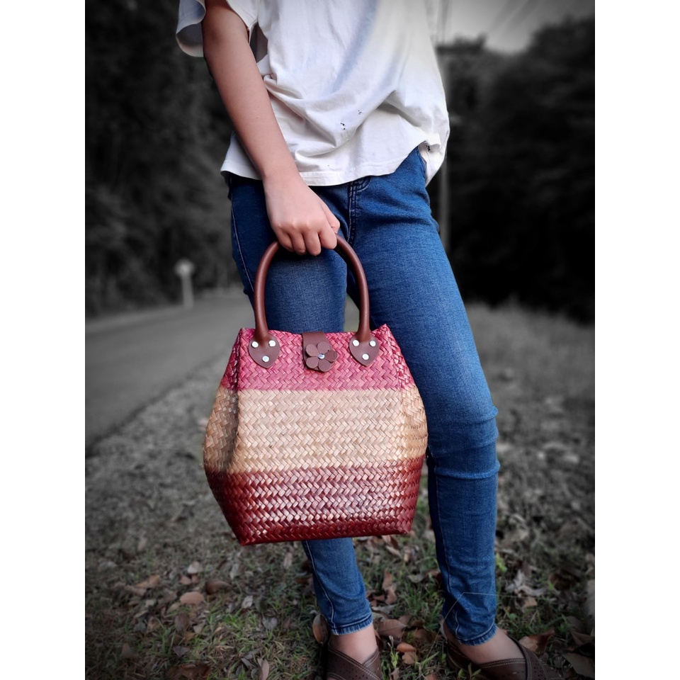 ไม่แถมพู่ ขนาด 8*8*10 นิ้วทรง 3 จีบ ไม่บุผ้า กระเป๋าสาน กระจูด ของฝากของขวัญ ตะกร้าสาน กระเช้าสาน กระเป๋าถือ
