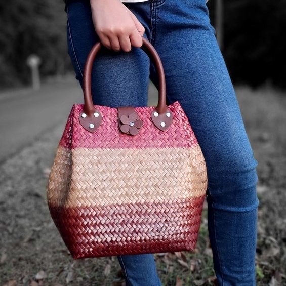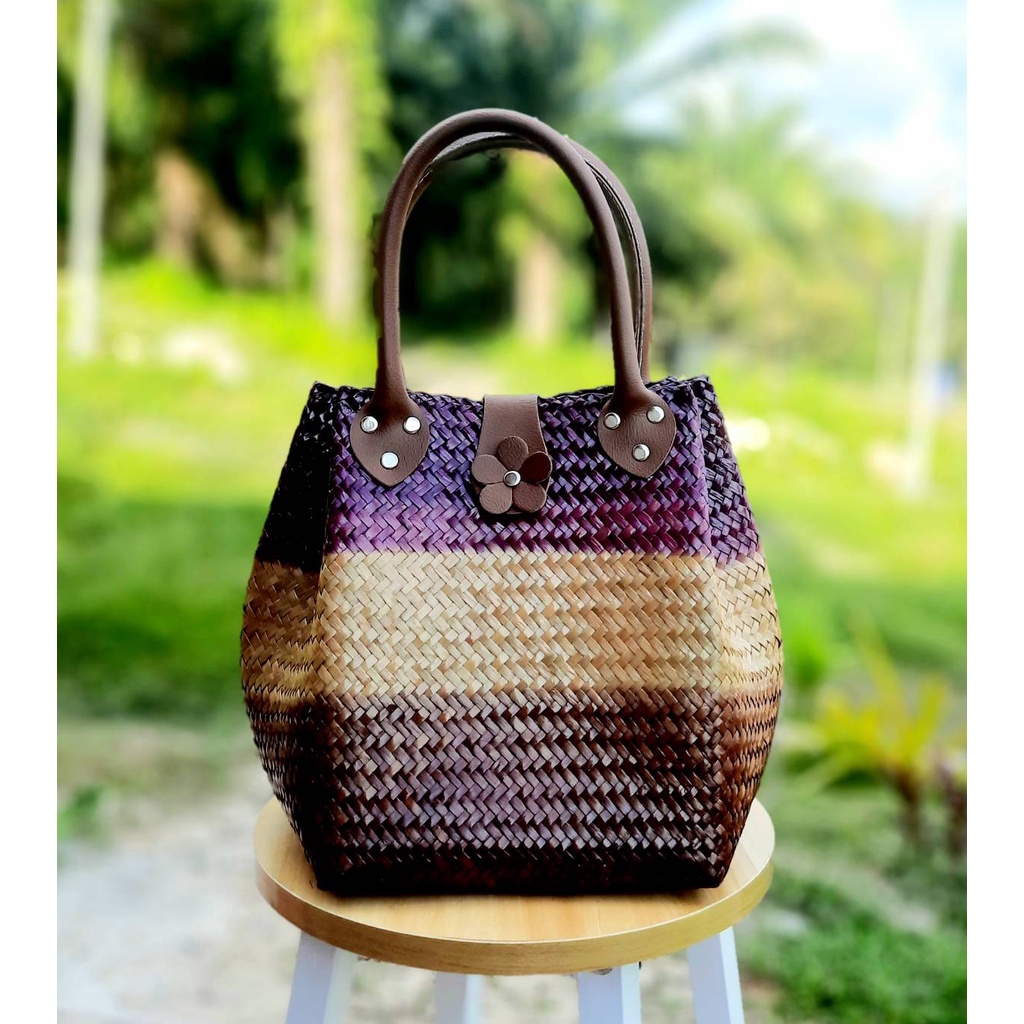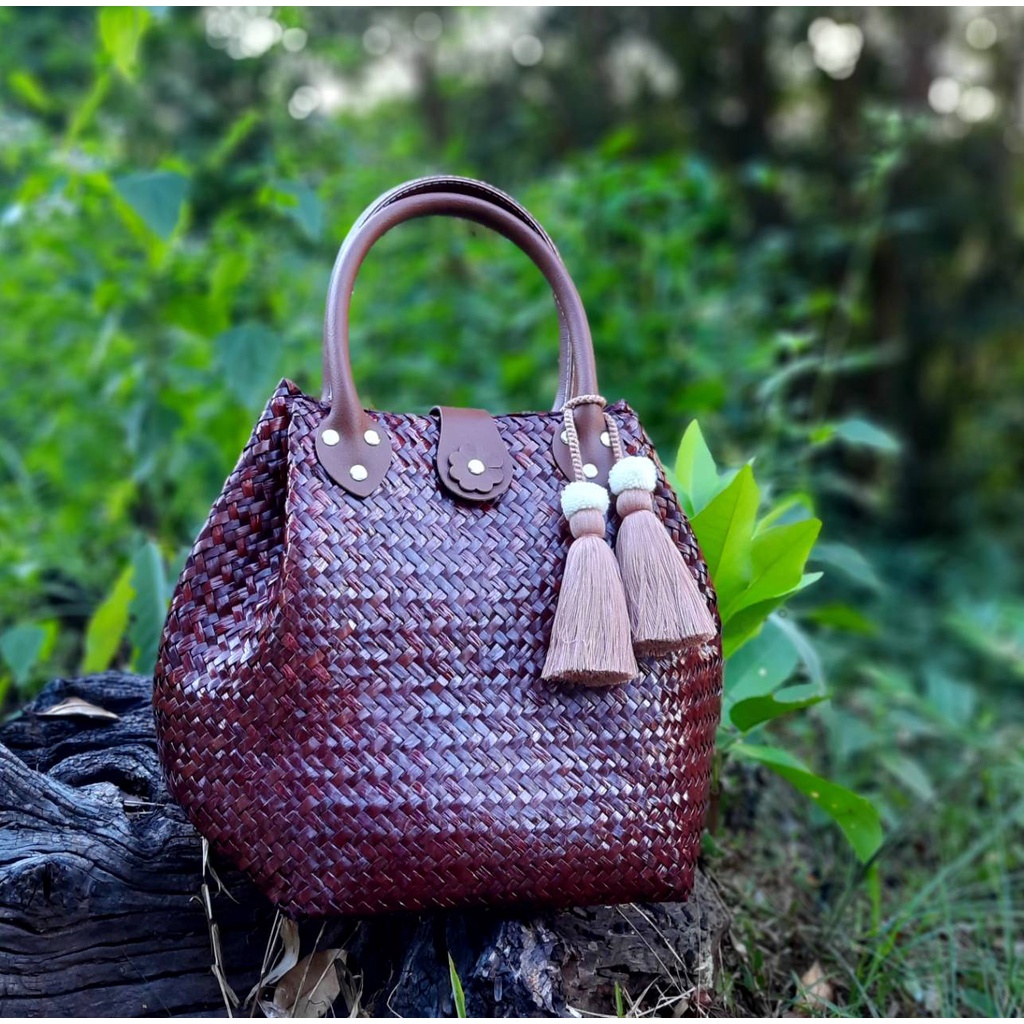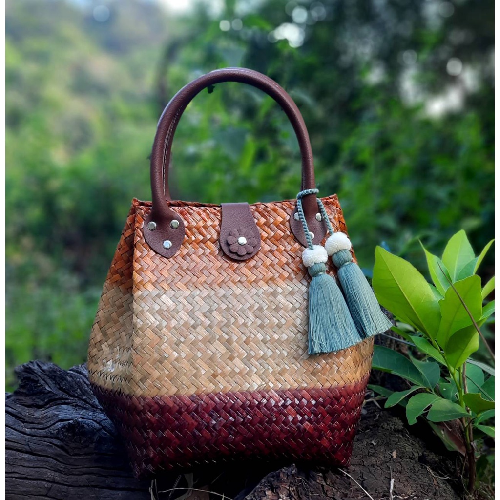 ไม่แถมพู่ ขนาด 8*8*10 นิ้วทรง 3 จีบ ไม่บุผ้า กระเป๋าสาน กระจูด ของฝากของขวัญ ตะกร้าสาน กระเช้าสาน กระเป๋าถือ