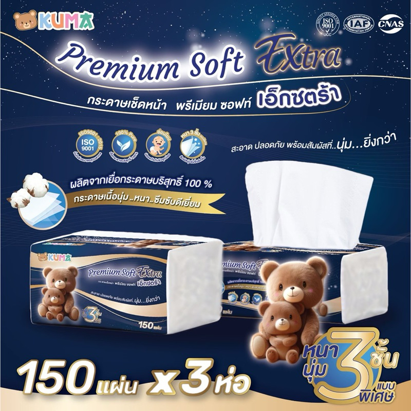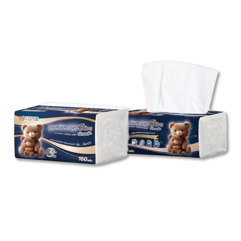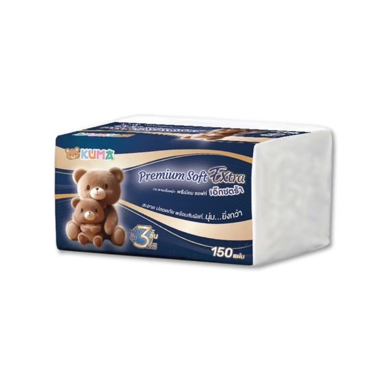 Kuma Premium Soft Extra กระดาษทิชชู่เช็ดหน้าคุมะ พรีเมี่ยม ซอฟท์ เอ็กซ์ตร้า 150แผ่น ยกแพ็ค 3ห่อ
