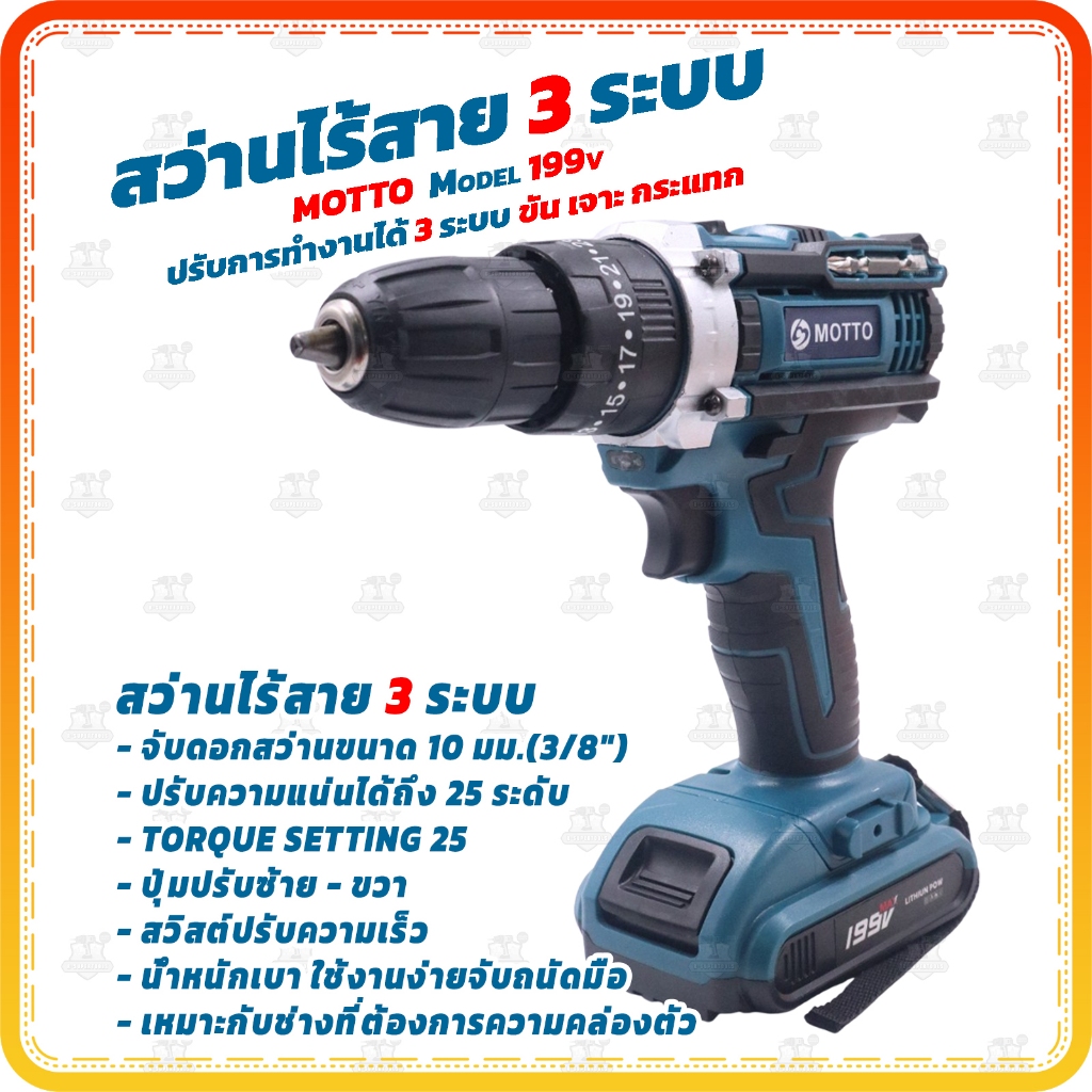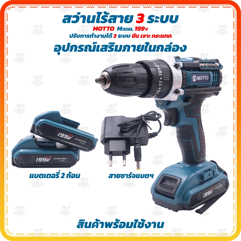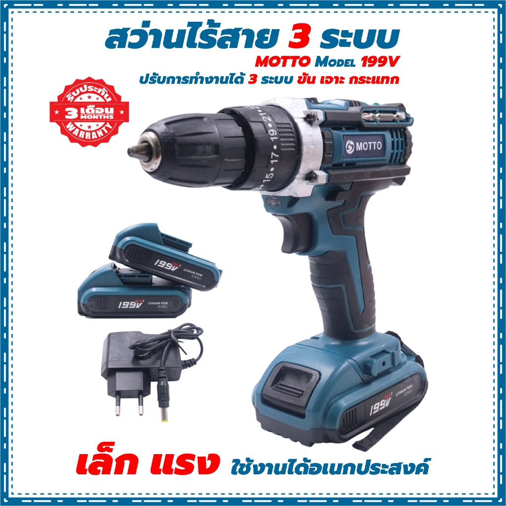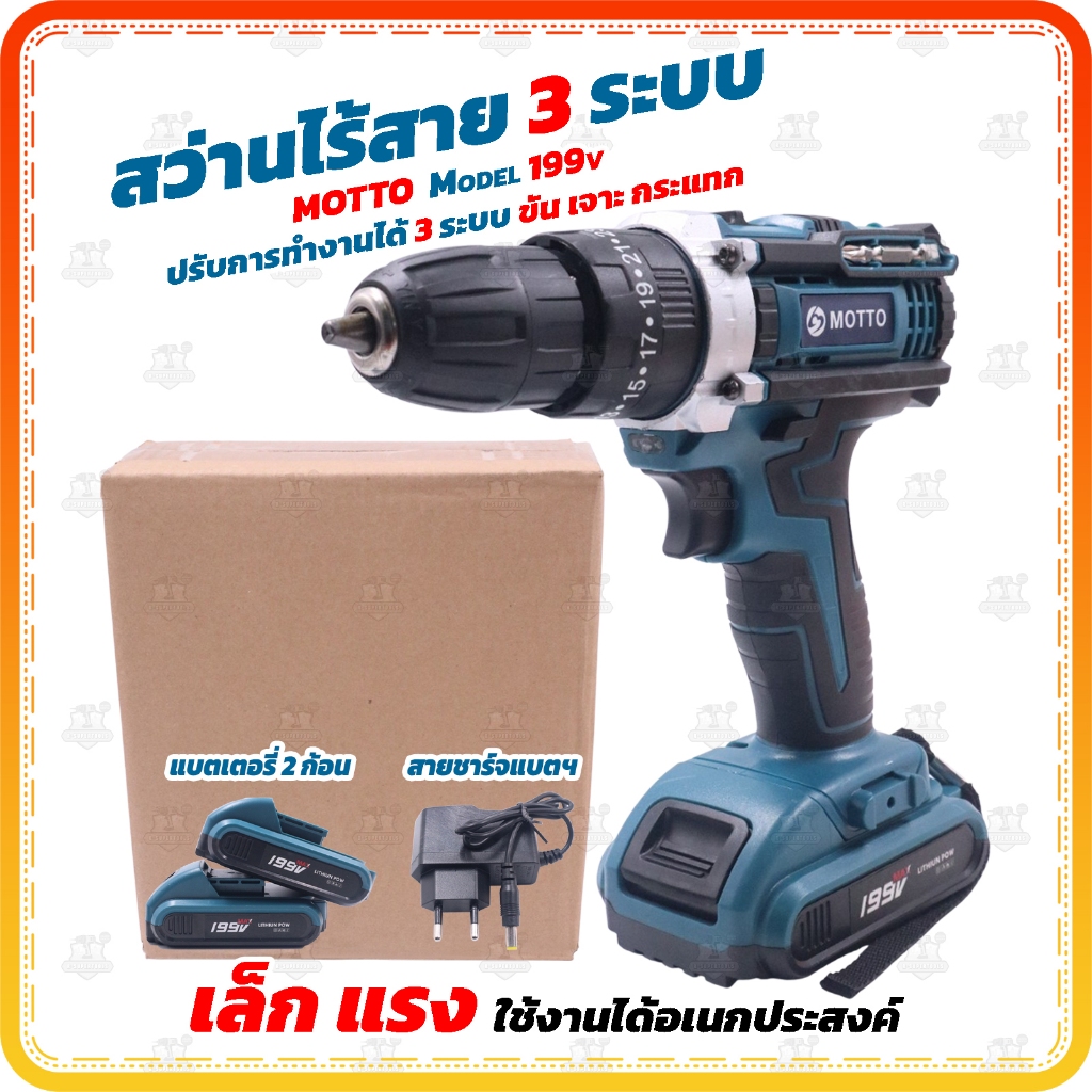 MOTTO สว่านไร้สาย สว่าน 199V 3 ระบบ มีขัน เจาะ กระแทก แบตเตอรี่ Li-ion อย่างดี 2 ก้อน
