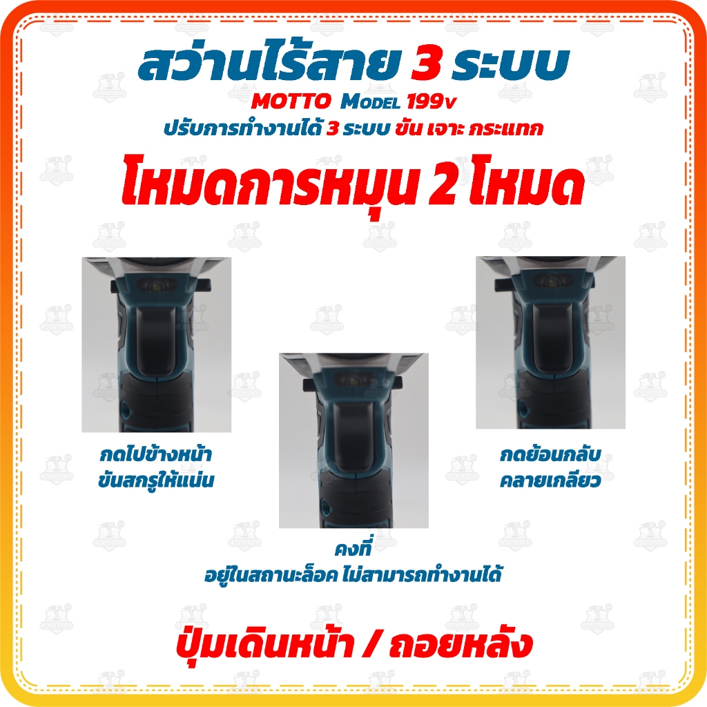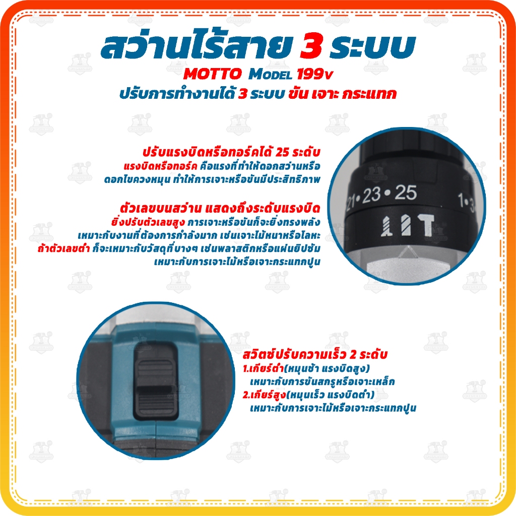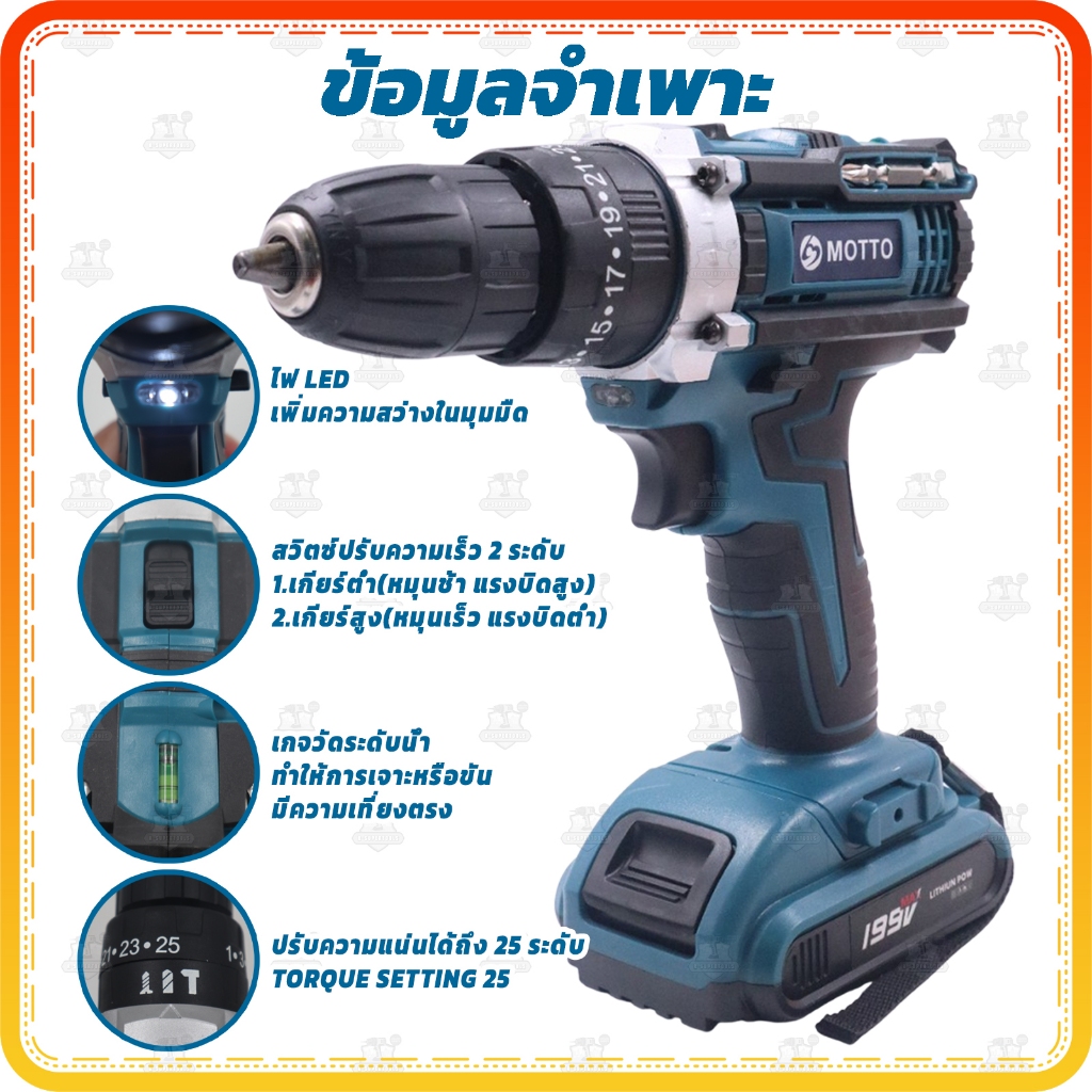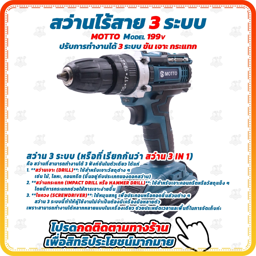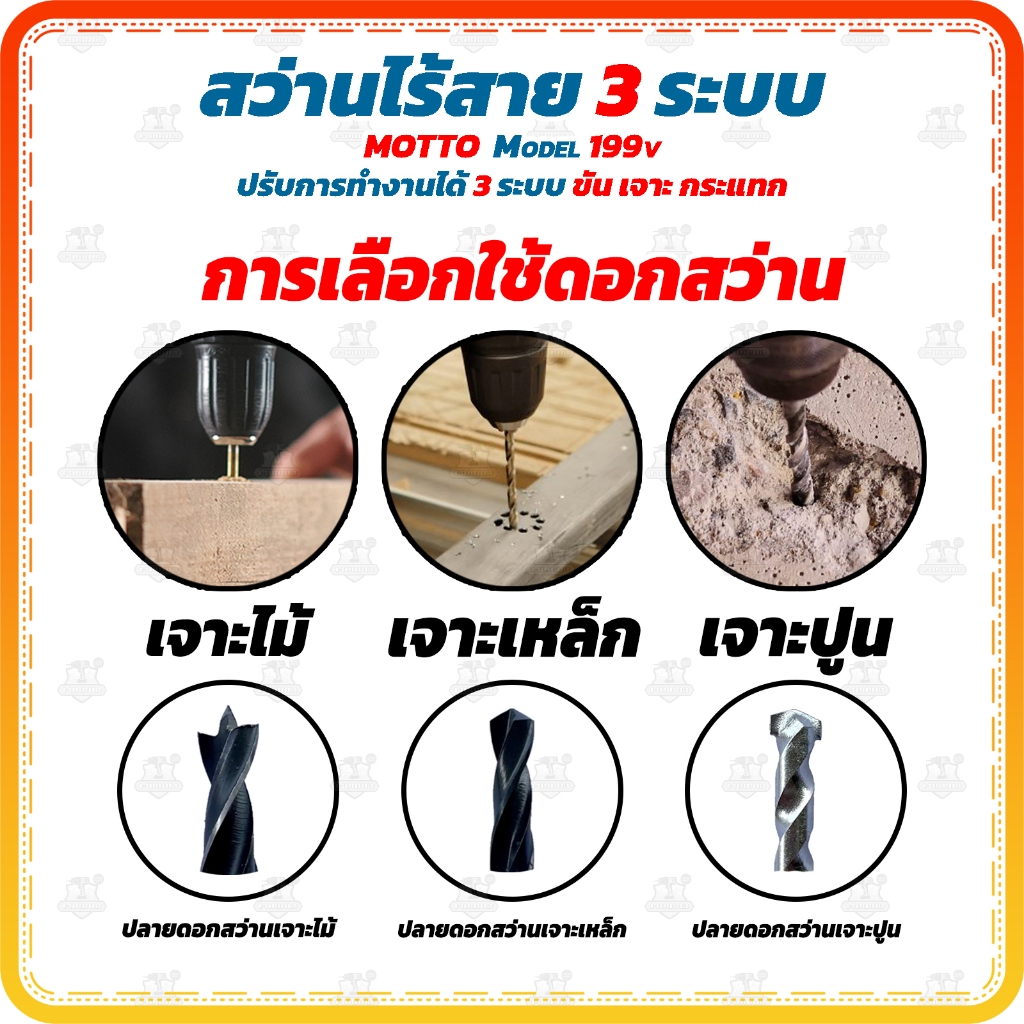 MOTTO สว่านไร้สาย สว่าน 199V 3 ระบบ มีขัน เจาะ กระแทก แบตเตอรี่ Li-ion อย่างดี 2 ก้อน