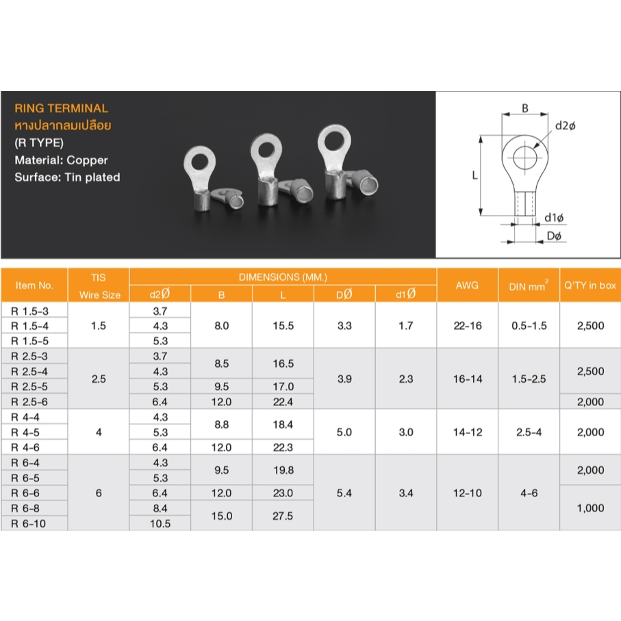 RING TERMINAL (R TYPE) หางปลากลมเปลือย T-LUG(ทีลักซ์) บรรจุถุงละ(10ตัว)