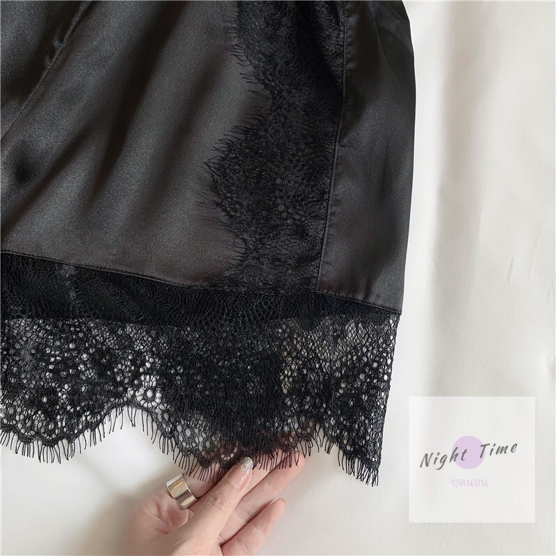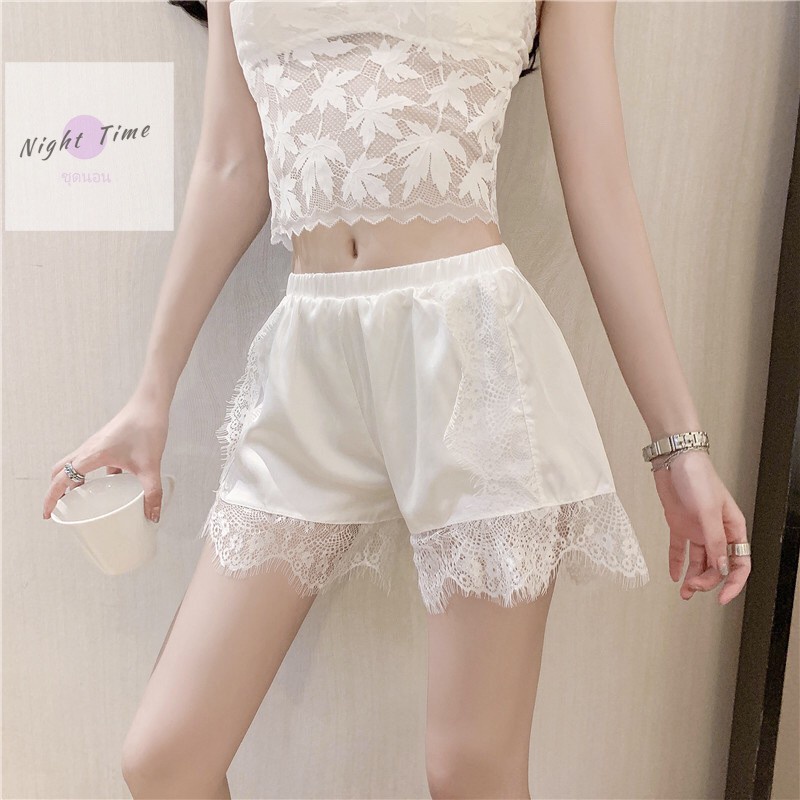 กางเกงนอน กางเกงนอนขาสั้น ผ้าซาตินใส่นอนระบายลูกไม้ N-434