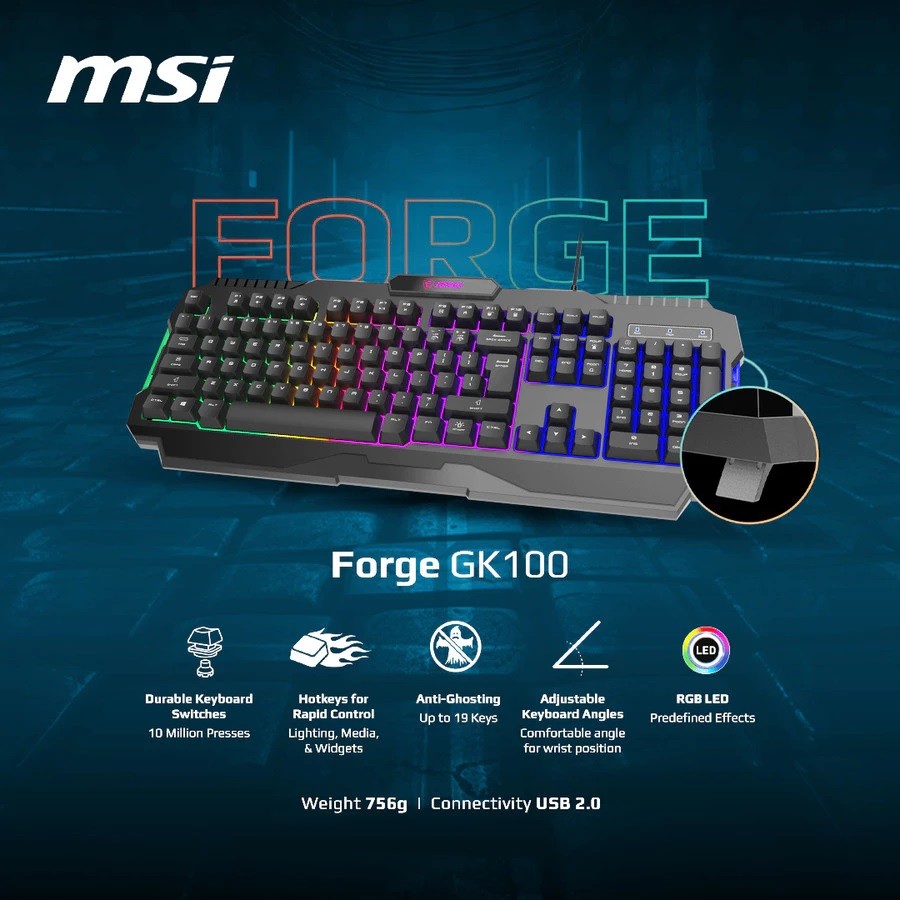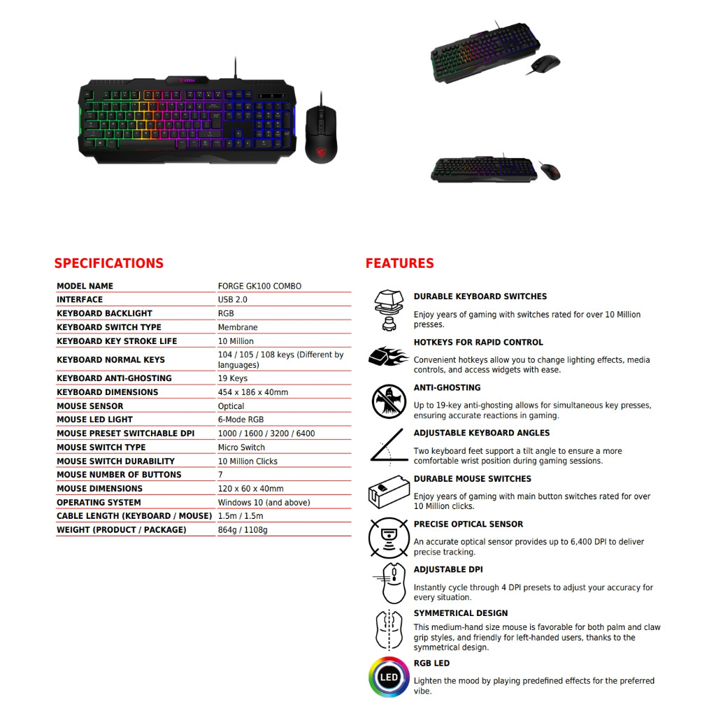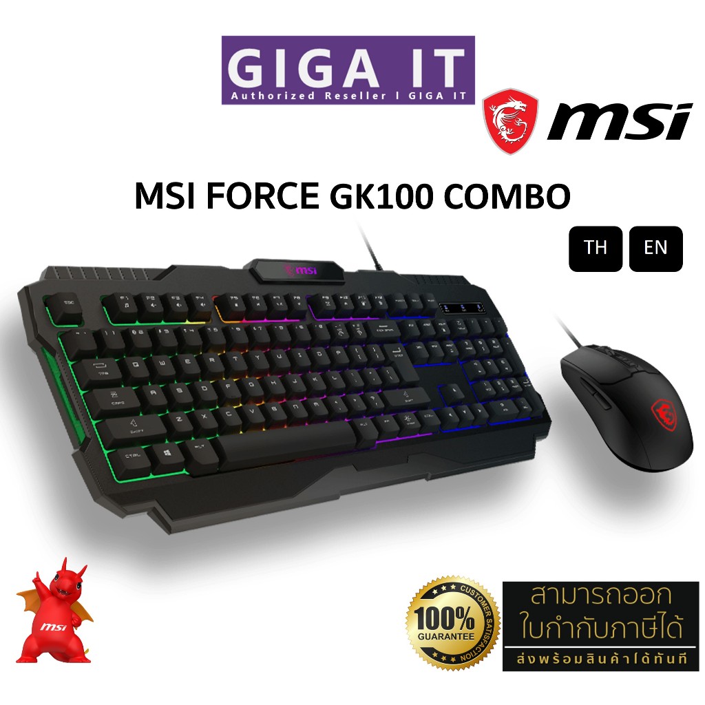 MSI FORGE GK100 COMBO ชุดเมาส์และคีย์บอร์ดเกมมิ่ง (USB RGB KB Membrane, Mouse Optical RGB 4DPI presets upto 6400 DPI)