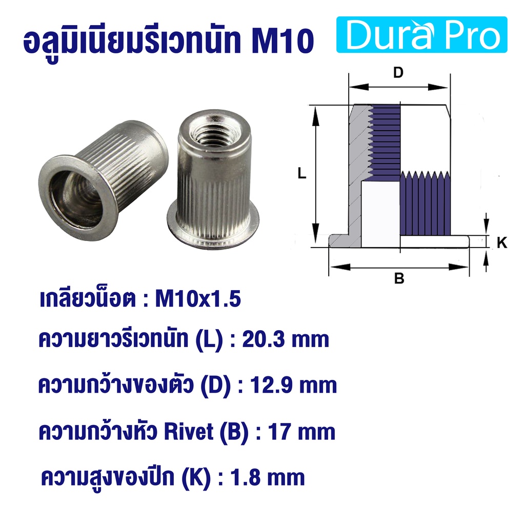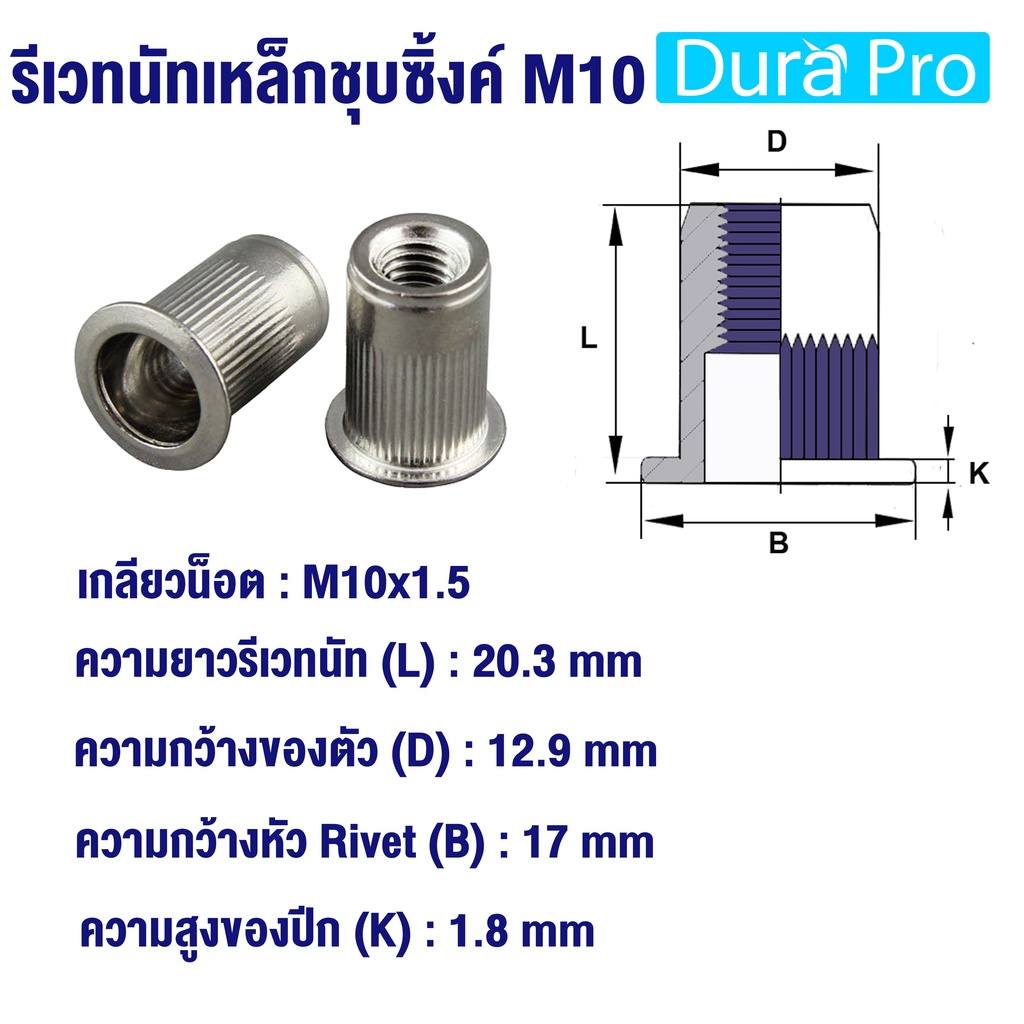 รีเวทนัท รีเวทนัทอลูมิเนียม รีเวทนัทเหล็กชุบซิ้งค์ รีเวทนัทสแตนเลส เบอร์ M10 RIVET NUT ลูกรีเวท ลูกรีเวทนัท น็อตรีเวท