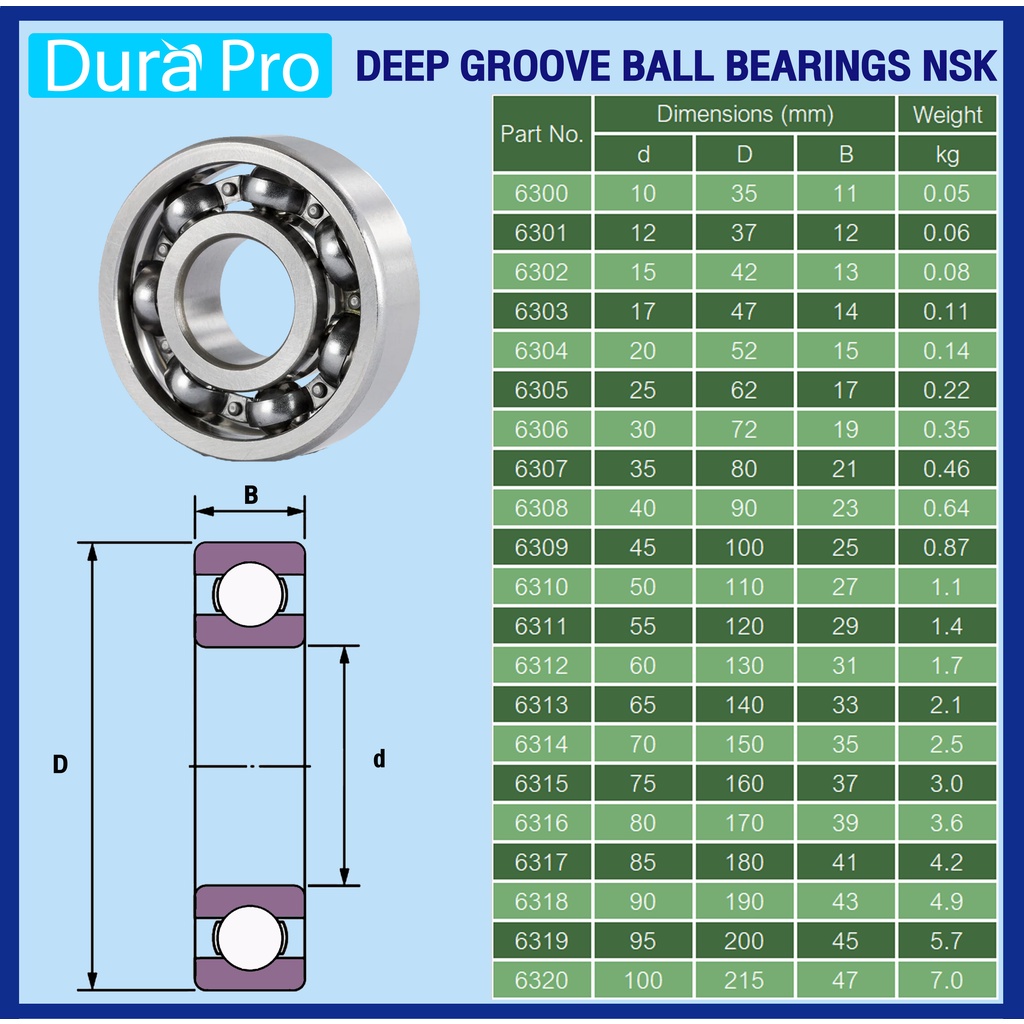 NSK 6300 6301 6302 6303 6304 6305 ตลับลูกปืนเม็ดกลมร่องลึก ฝาเปิด OPEN (DEEP GROOVE BALL BEARINGS NSK) โดย Dura Pro